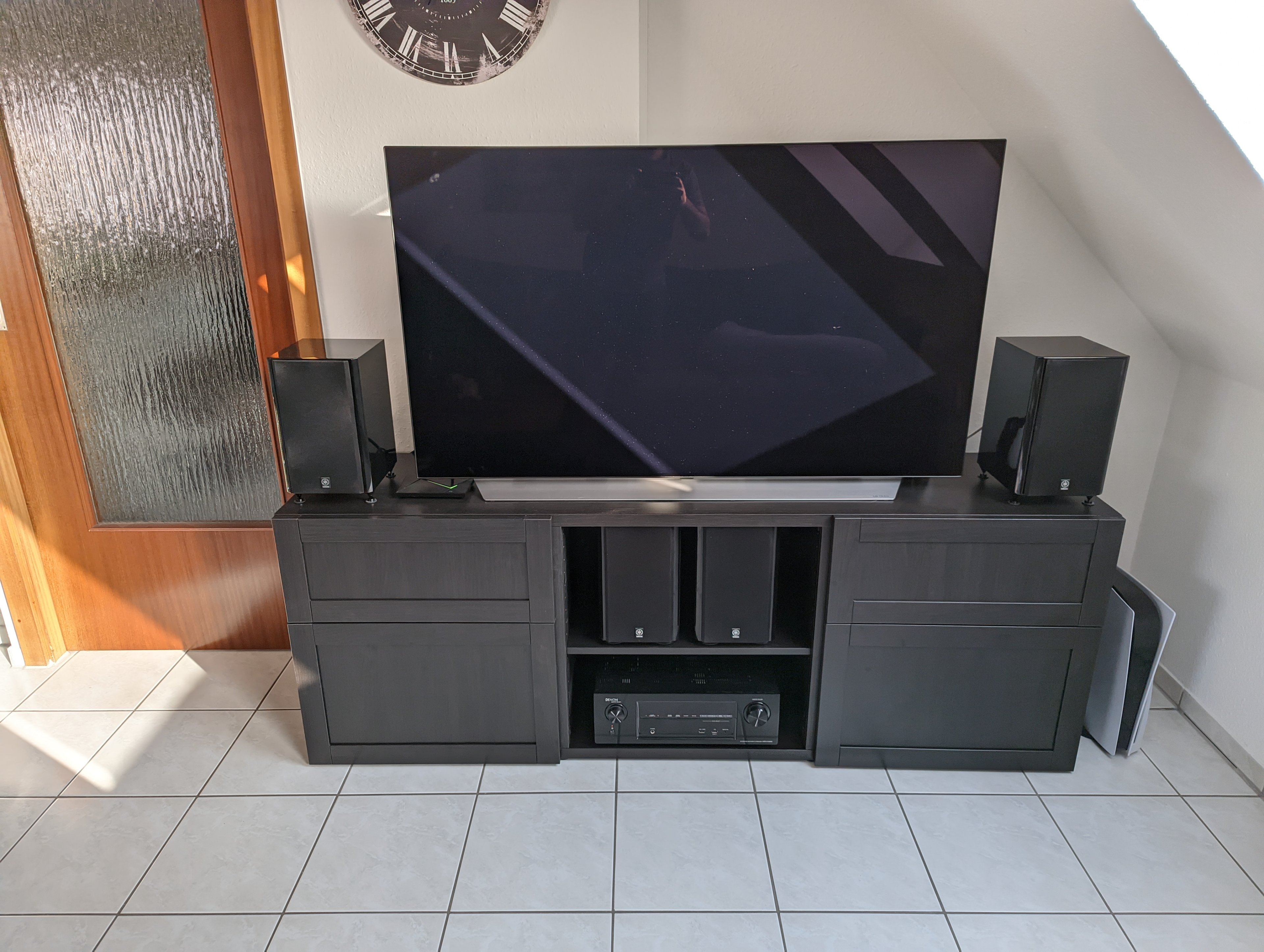 Vorteil vom neuen Lowboard: es ist deutlich höher als das jetzige, die Speaker werden darauf also ihren Platz finden. Momentan stehen sie auf dem Boden (trotzdem tausend Mal besserer Sound als die Soundbars!).