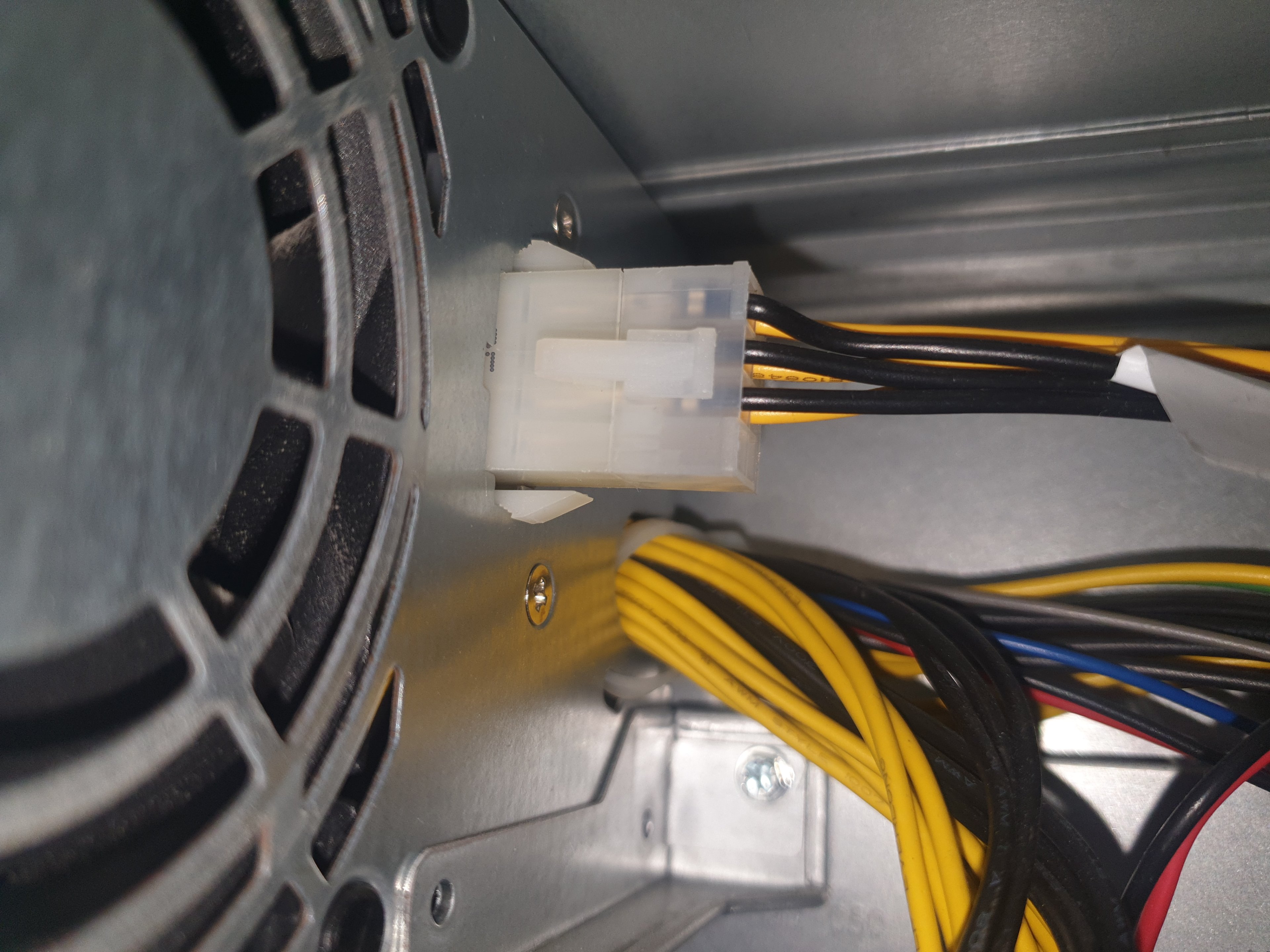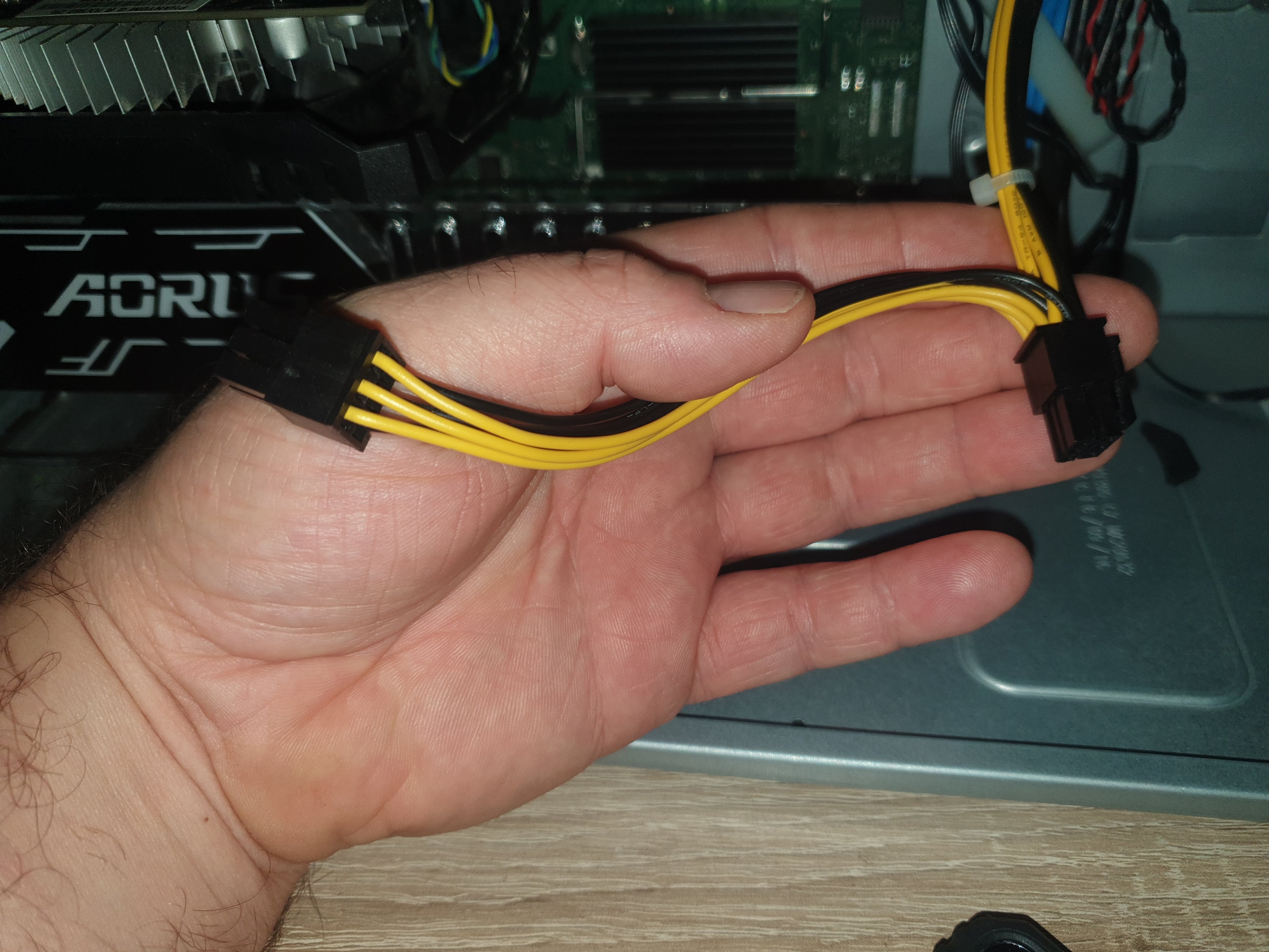 Unser Problem ist das der PC am Netzteil zwar einen 8 pin Stecker hat davon aber nur 6 pins belegt sind welche in ein blindes Kabel enden mit 6 pin stecker. (Leihenhaft erklärt)