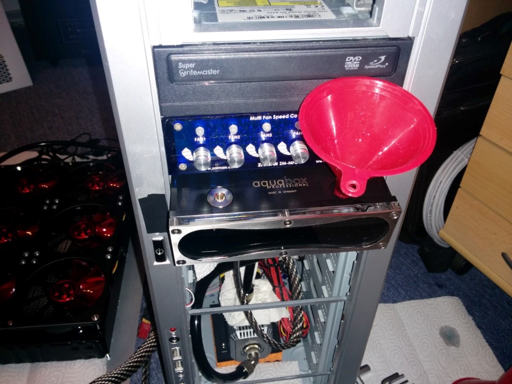 Das Befüllen war eher knifflig, da man die Aquabox nicht weit herausziehen kann, ohne dass sie nach unten weg fällt. Außerdem muss hat man maximal 100ml die in den Kreislauf laufen (wenn überhaupt) und bei mehr läuft sie direkt über. Sobald der Wasserstand unter der Hälfte ist, zieht der AGB wieder Luft. Ich musste bestimmt locker 6,7 mal nachkippen und hab mich mindestens 3 mal mit der giftigen Brühe eingesaut. Legt genug Küchenrolle etc. aus! Sonst läuft der Kack evt. richtung HDDs. Zwar nicht schlimm aber trotzdem unschön.