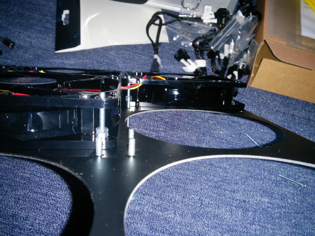 Überhaupt frage ich mich, was die Chinesen beim Design der Gewinde geritten hat. Sobald man die Lüfterblende voll bestückt, verzieht sie sich so stark, dass man die 4te Imbus M3 (an jeder Ecke eine) nicht mehr in den Radi kriegt. Ich habe sie dann abgeknippst und aus optischen Gründen mit Sekunden Kleber angeklebt