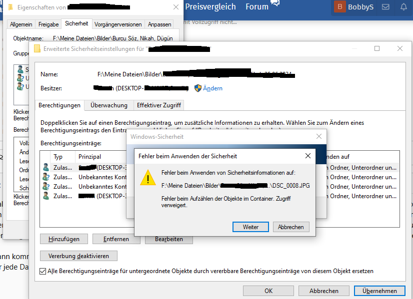 Hallo. Wie der Titel sagt, kann ich die Berechtigung nicht auf meinen Nutzer komplett für den Ordner übergeben, sondern bekomme ich eine Fehlermedlung für jede einzelne Datein in dem Ordner, obwohl ich anklicke, dass es für alle Dateien im Ordner übernommen werden soll. Dabei gehe ich so vor: Eigenschaften > Sicherheit > Erweitert > Prinzipial hinzufügen > Eingabe des Nutzers > Neuen Berechtigungseintrag hinzufügen > Eingabe des Nutzers mit Vollzugriff > Anklicken dass es für alle Dateien übernommen werden soll