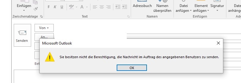 Angemeldet ist er mit dem Büronutzer und auch so im Outlook - Senden als & Vollzugriffsrecht im Exchange für das Private gewährt, jedoch seit dieser Woche bekommt er beim Senden als (Privat) die Meldung "Sie besitzen nicht die Berechtigung...".