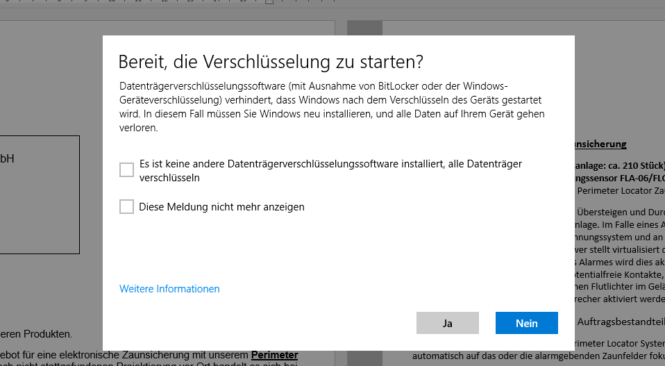 Ich denke ja das dies eben von Bitlocker KOMMT und die Verschlüßelung daher auch nicht aktiv ist bis sie da bestätigt (und gestartet) wird. Aber das ist reiner Spekulatius.