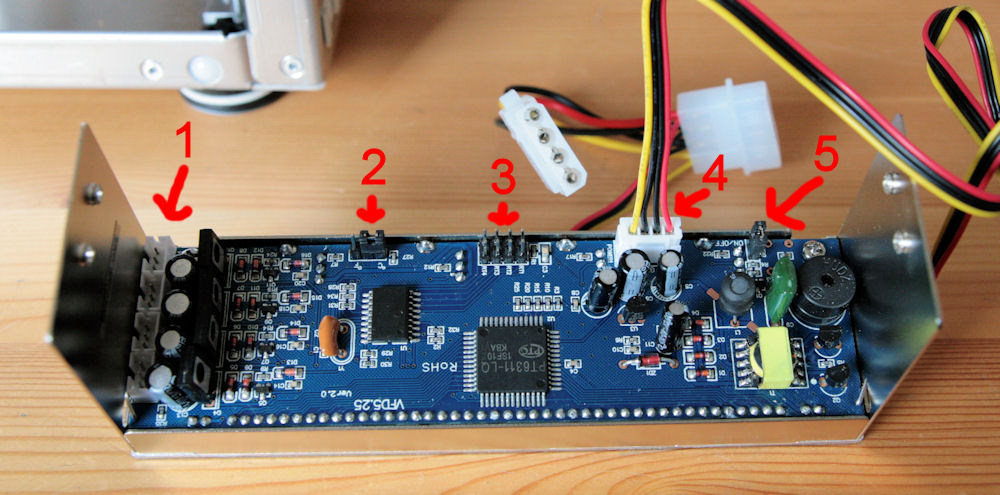 - Hier befinden sich die Steckplätze für die Lüfteranschlusskabel 1-4. Man sollte mittels einer Flachzange noch mal nachdrücken, damit die Anschlüsse richtig drin sitzen. Die Steckplätze hätte man wirklich woanders platzieren sollen.