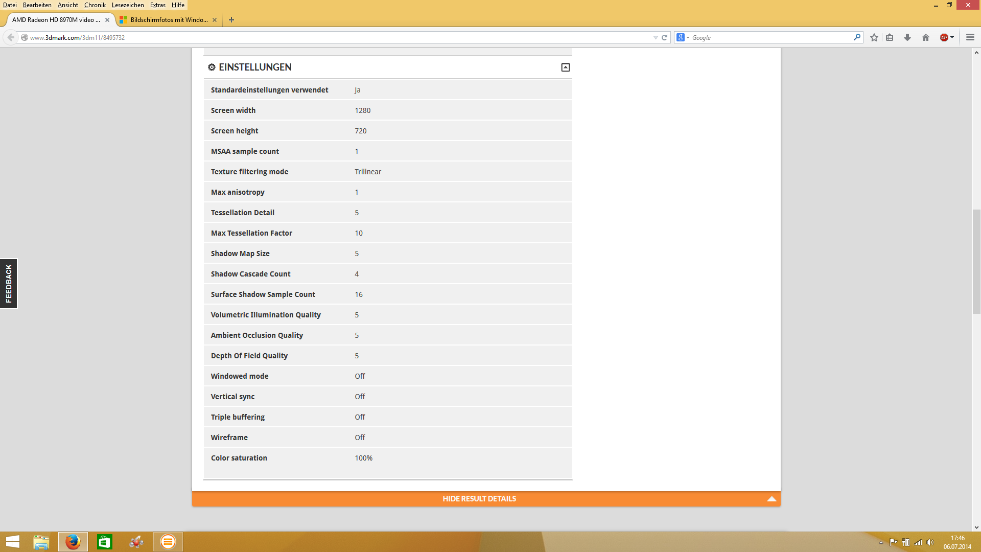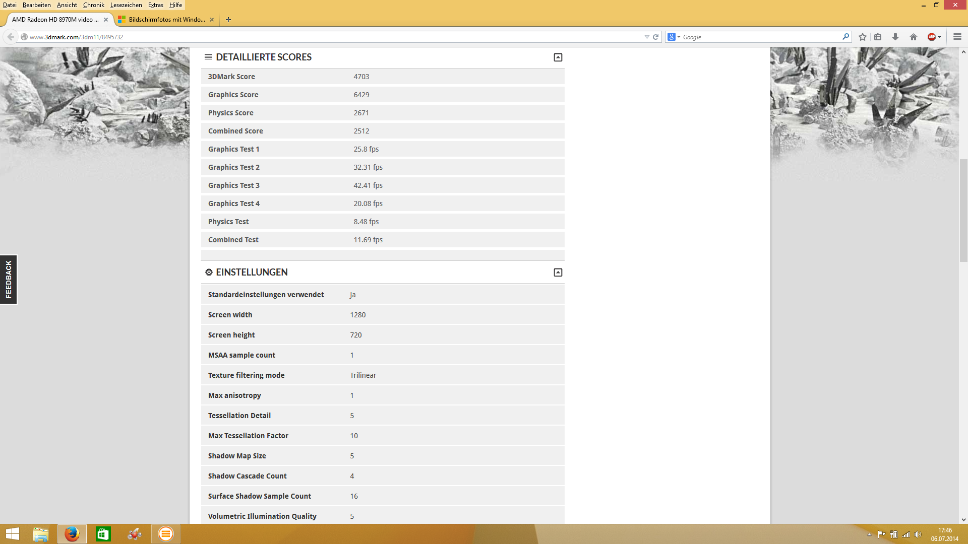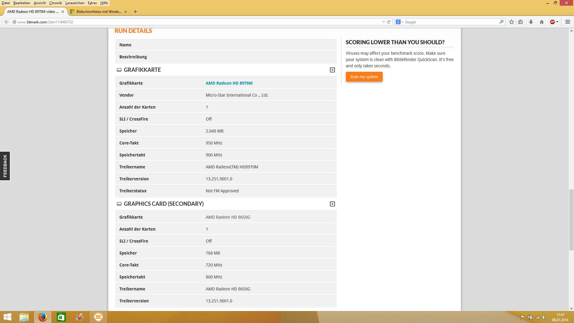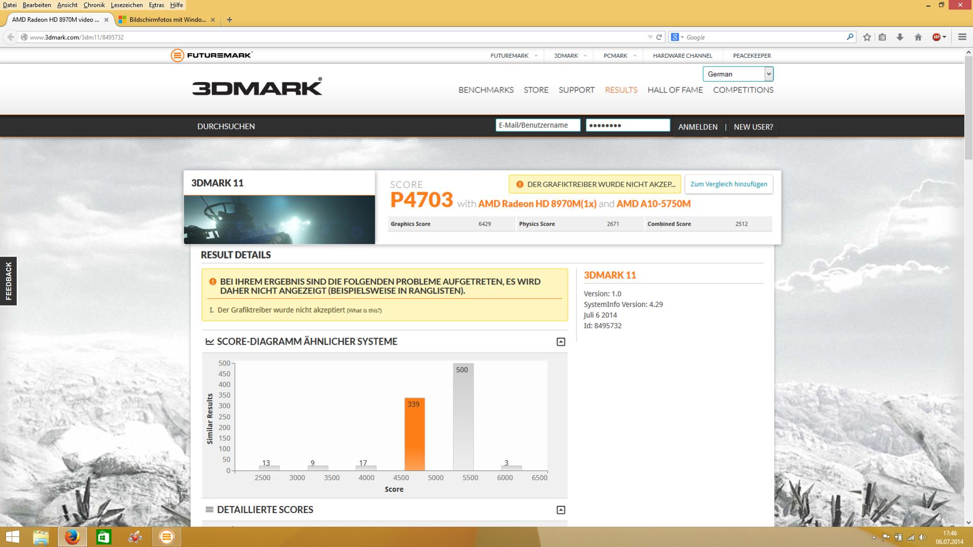 Du deutest die Grafik vollkommen falsch. Dass dein Treiber nicht akzeptiert wurde ist nur für die offizielle Bewertung relevant. Deine Grafikkarte (HD 8970M) erreicht in Benchmarks etwa 6800 Punkte. Hier in deinem Benchmark waren es 6400 Punkte - liegt entweder an deinem Treiber oder einem etwas zugemüllten System. Eventuell sogar an der CPU. Aber der Wert ist okay und quasi ein Beweis, dass deine GPU aktiv ist.