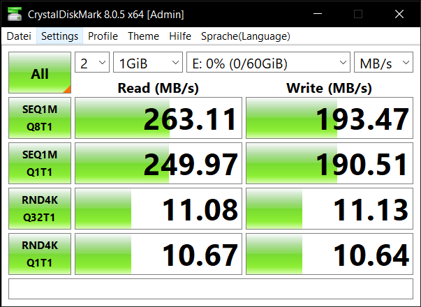 Kurioserweise ist mir heute aufgefallen, dass die synthetischen Schreibwerte meines USB Sticks steigen, je mehr Speicherplatz belegt ist. Die Lesewerte sind erstaunlich konstant. Alle Benchmarks habe ich mehrfach ausgeführt: