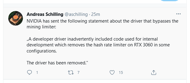 Statement von nvidia: https://twitter.com/aschilling/status/1371765349440483330