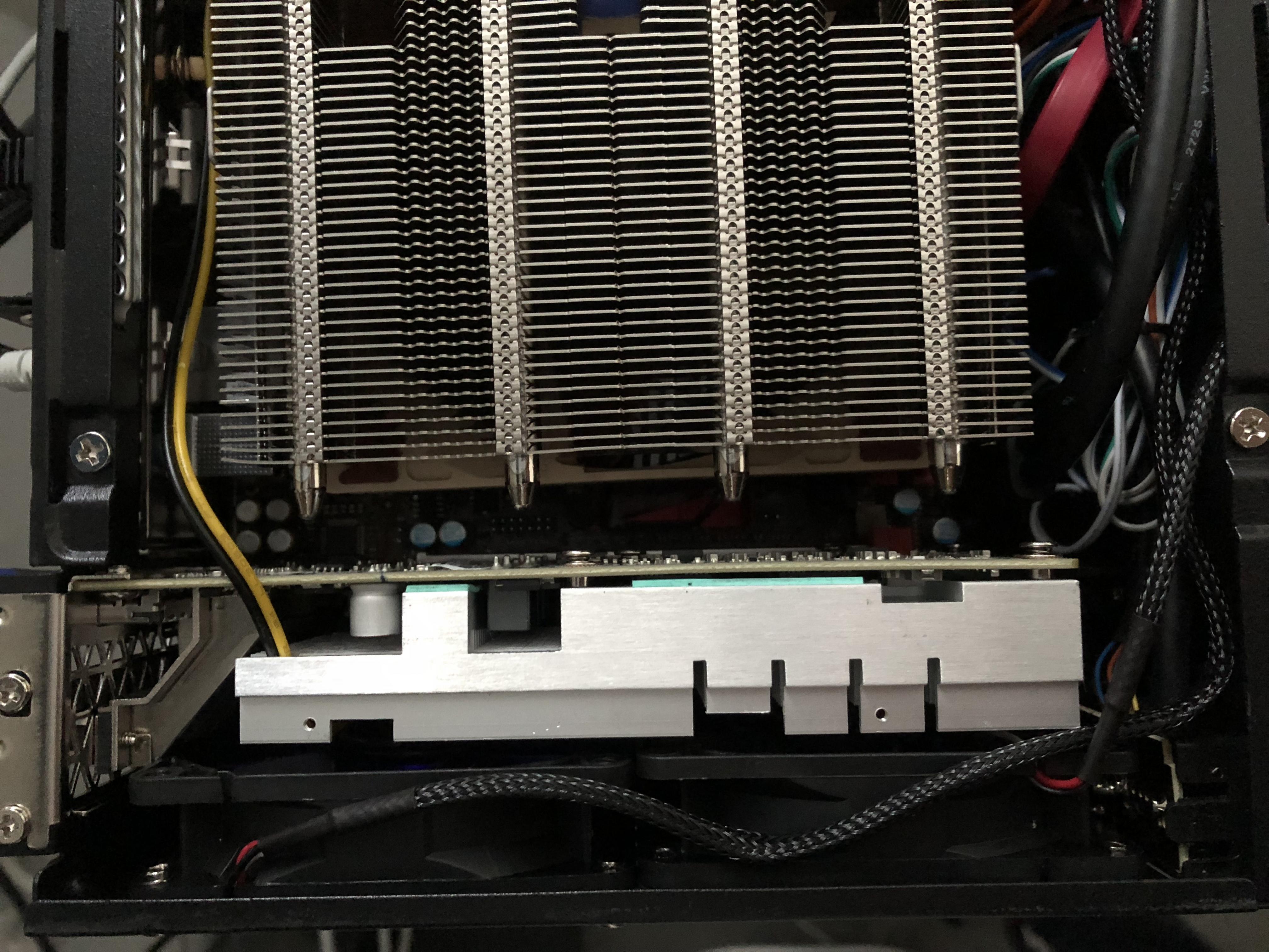 Eine andere Variante wäre 2 40mm Noctua Lüfter direkt auf dem Kühlkörper zu befestigen https://geizhals.de/?cat=coolfan&xf=1034_Noctua~355_40~5920_3-Pin dann hätte ich die Dimensionen des originalen Lüfters, bin aber nicht sicher ob die Karte dann unter Last nicht wieder zu warm wird. Im Idle sollten die Noctuas ziemlich sicher unhörbar zu bekommen sein.