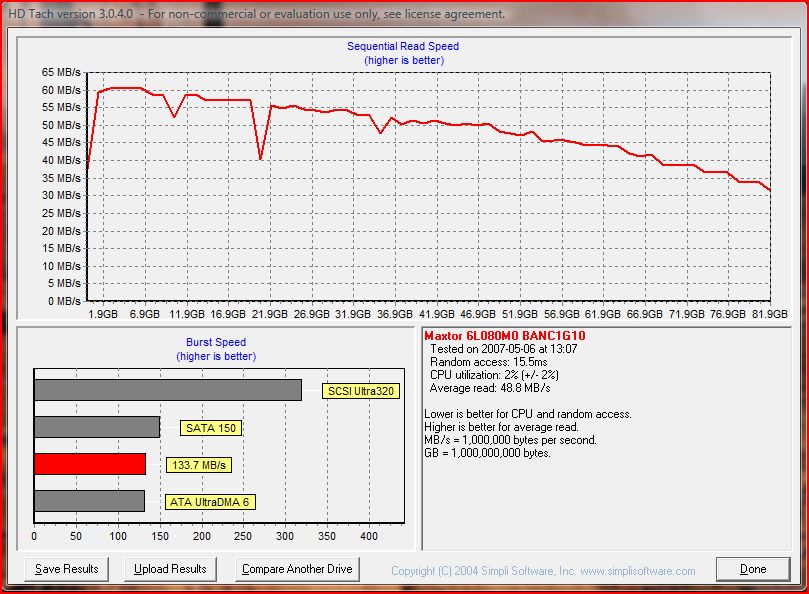 Ach ja die Platte ist mit SATA 1 angeschlossen und ich hab da mal ein Screen von HD Tach.