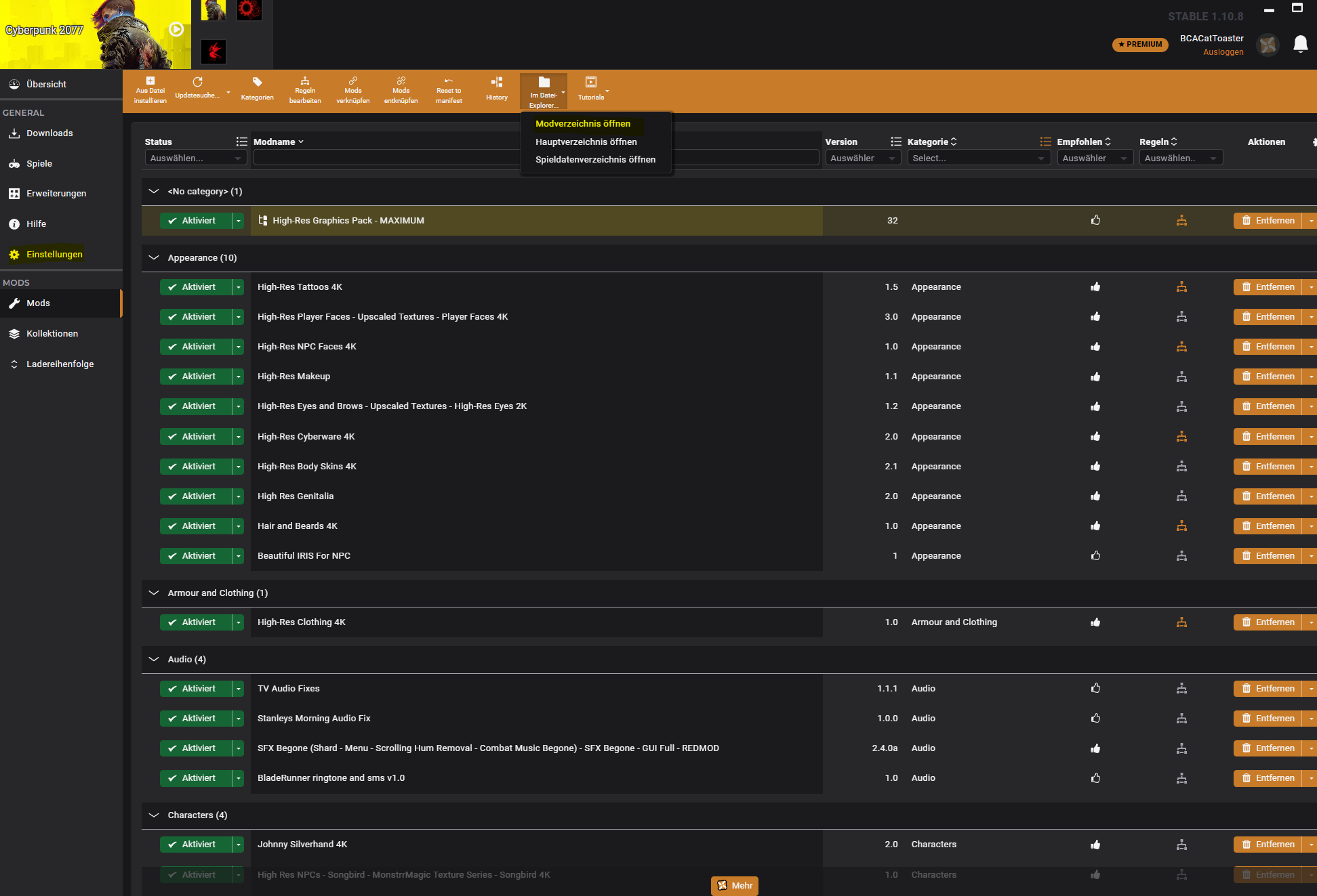 Noch etwas, ich sehe in den ganzen Videos wo die Mods installiert wurden, bzgl. Cyberpunk 2077, das die Spieler daraufhin immer im Hauptmenü " Mods " stehen haben, bei mir kommt das nicht, bin mir aber sicher das ich es nach Aneitung korrekt gemacht habe. Z.b. die HD Reworked Project Mod, da muss man ja diese nur laden, entpacken und den Inhalt ins Installationsverzeichnis kopieren vom Spiel und die Ordnerstruktur sollte dann so aussehen Cyberpunk 2077\archive\pc\mod\HD Reworked Project.archive