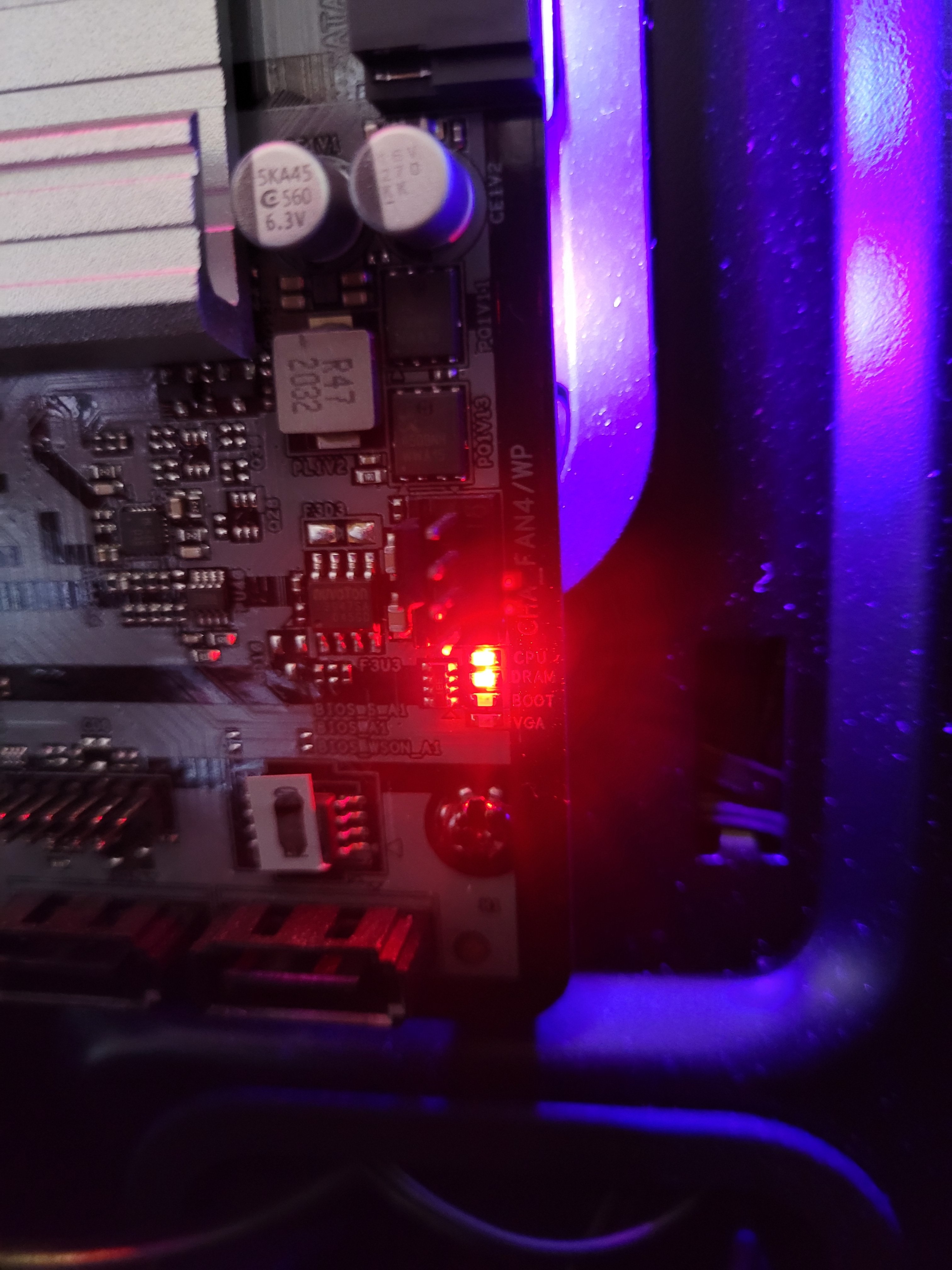 Der Start klingt normal, das RGB Zeug und die Lüfter gehen an, aber die CPU und DRAM LED leuchten durchgehend rot.