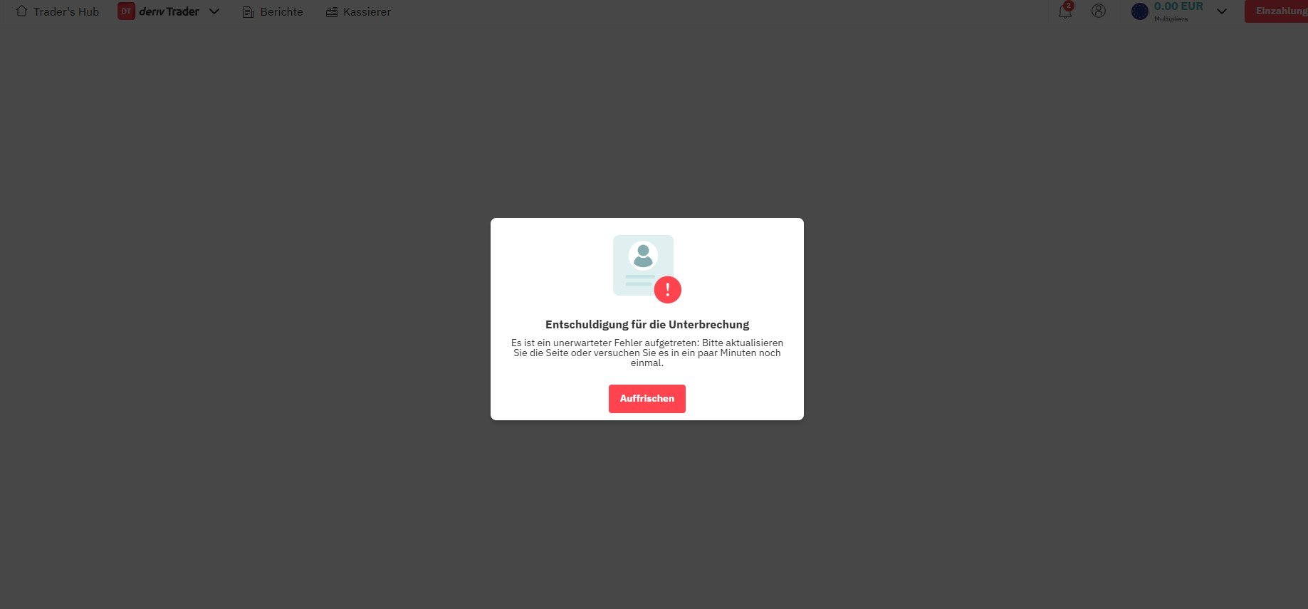 Ich habe mich gestern Abend auf deriv.com angemeldet und wollte den Verifizierungsprozess durchgehen, aber soweit komme ich leider nicht denn sobald ich eingeloggt bin, kommt alle paar Sekunden ein Popup mit einer Fehlermeldung : ich solle die Seite neu laden... (siehe Anhang) ... das geht die ganze Zeit so, egal was ich mache oder versuche anzuklicken.