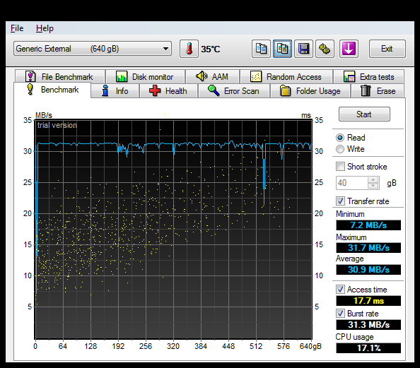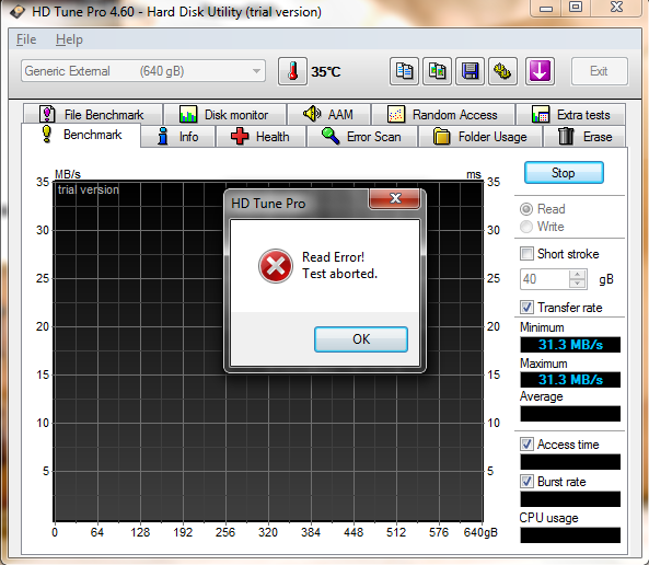 Eine Untersuchung mit HD Tune zeigt weitere, schlechte Nachrichten: