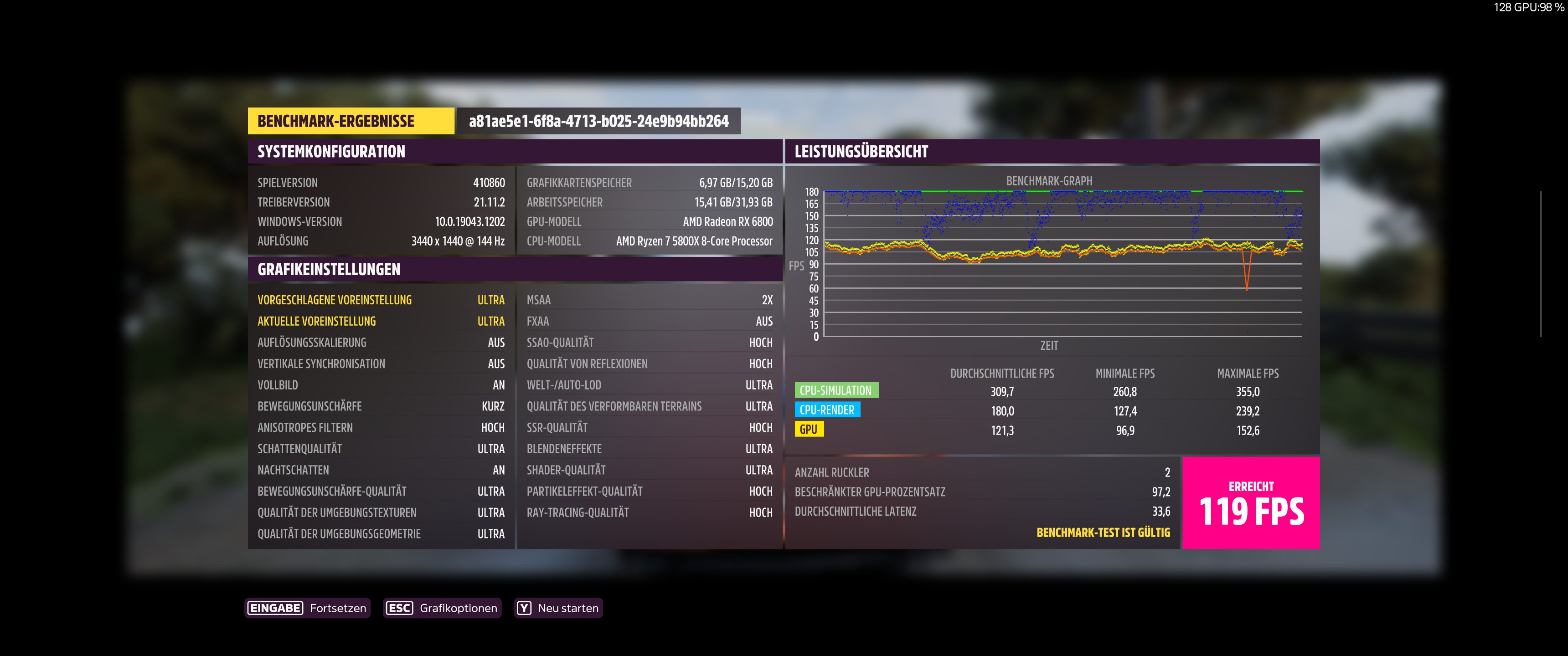 | 3.440 x 1.440, Preset Ultra: 97 | 3.440 x 1.440, Preset Ultra: 109 | +12FPS (12,4%) |