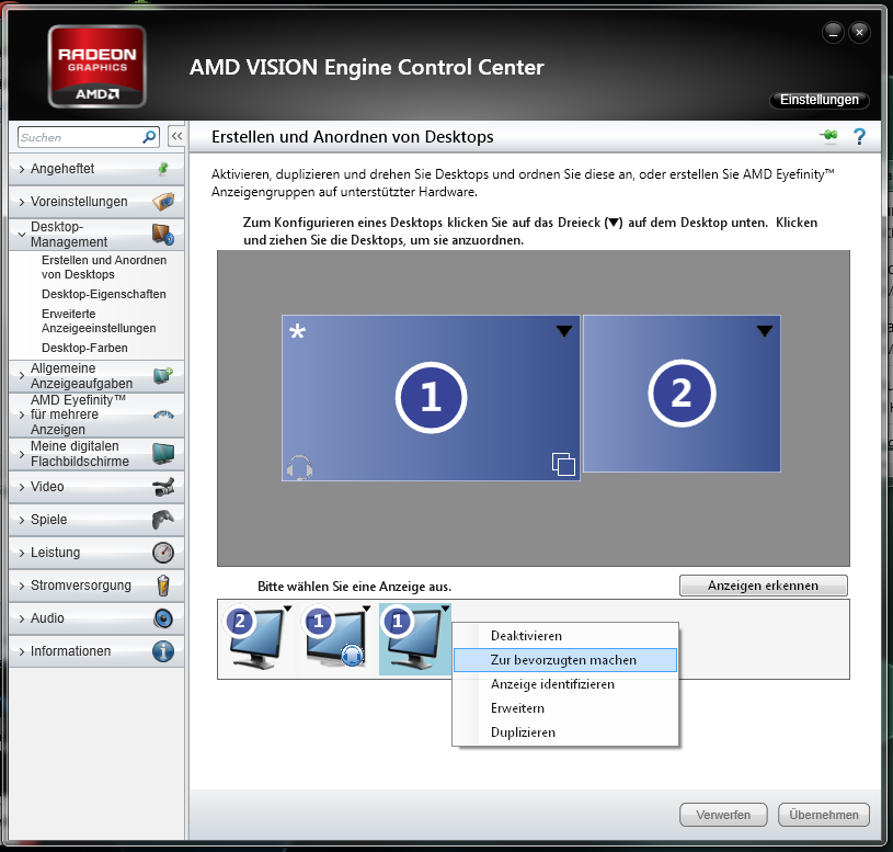Wenn ich Bildschirm 1 auf Bildschirm 2 dupliziere und dabei 2 Verschiedene Anschlüsse (HDMI und DVI) verwende, dann habe ich auf einem Gerät immer etwas Tearing. Im AMD Vision Control Center kann man ja ein Display zum bevorzugten machen (siehe Screenshot). Das bevorzugte Display hat dann kein Tearing.