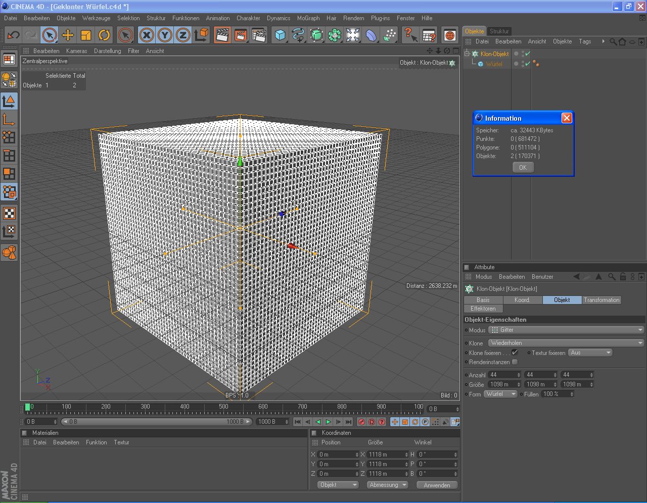 Unten habe ich eine einfache C4D R11.5 Projekt Datei, in der ein Würfel einfach nur Geklont wurde (44x44x44).
