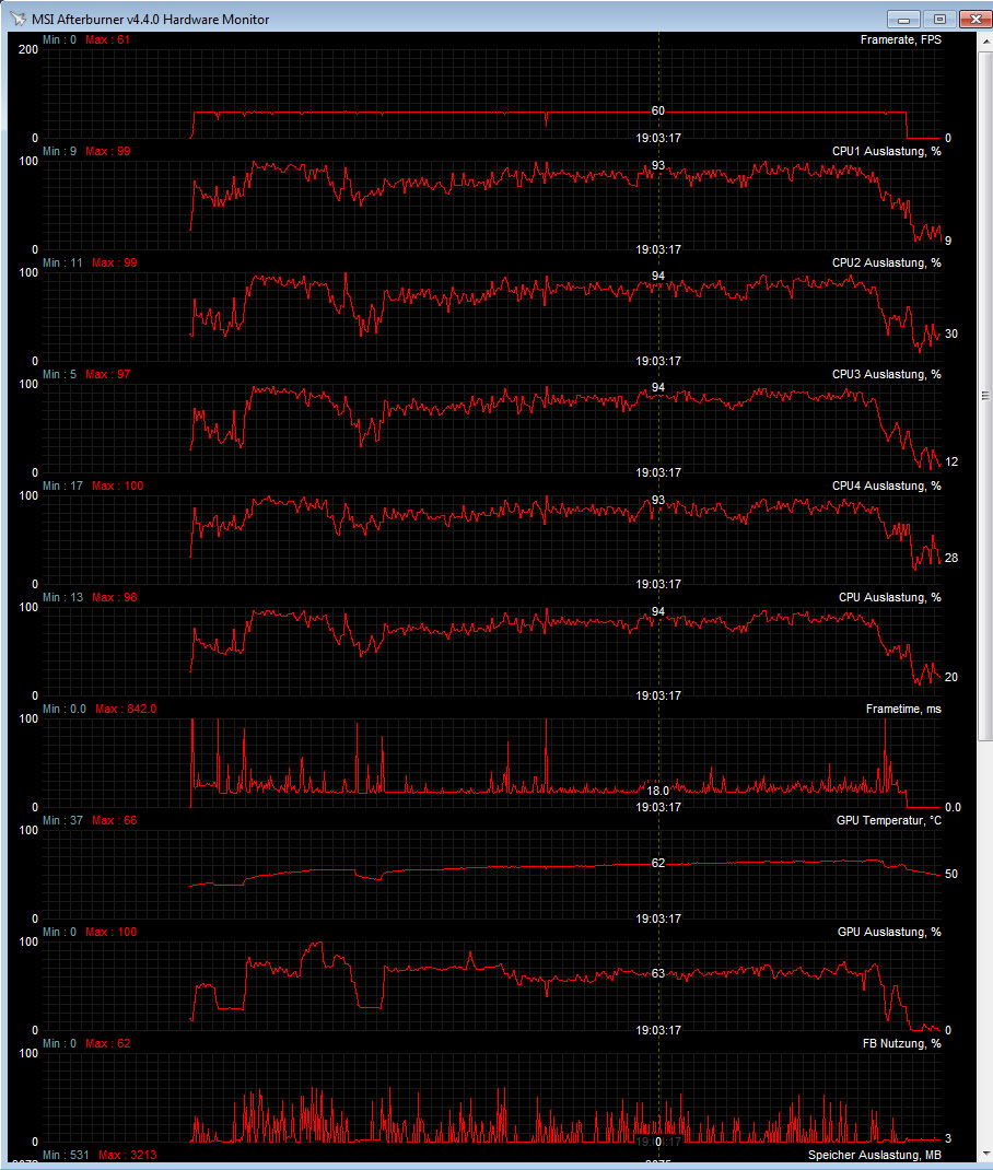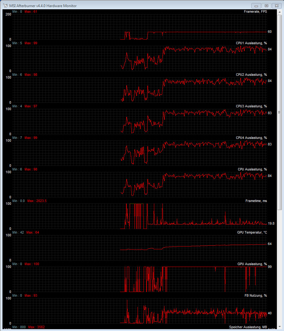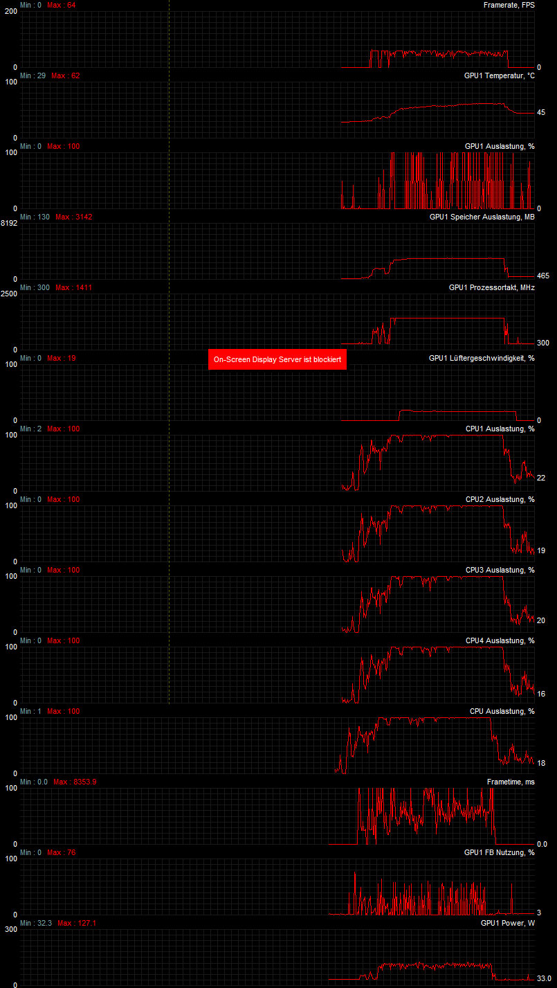 Die Auslastung der GPU fällt praktisch im Sekundentakt von 100 auf 0 und wieder auf 100 hoch, komischerweise bleiben die FPS "stabil". Des weiteren würde mich mal interessieren was die "frametime ms" aussagen, da diese auch extrem springen/schwanken. Leider hatte ich zu dem Zeitpunkt noch kein GPU-Takt zur Überwachung aktiviert. Das werde ich aber gleich mal machen um auszuschließen das die GPU runter taktet.
