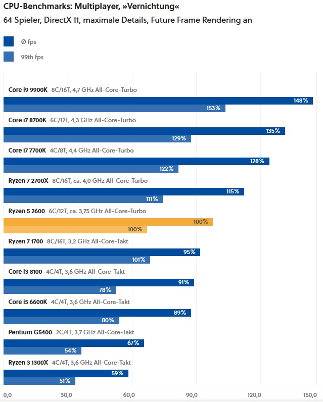 Hier einer der angesprochenen Benchmarks im Multiplayer von Gamestar (Den Ryzen2600 normiert auf 100%). Vergleichen sollte man immer die 99% FPS, MAX FPS ist nicht wirklich aussagekräftig: