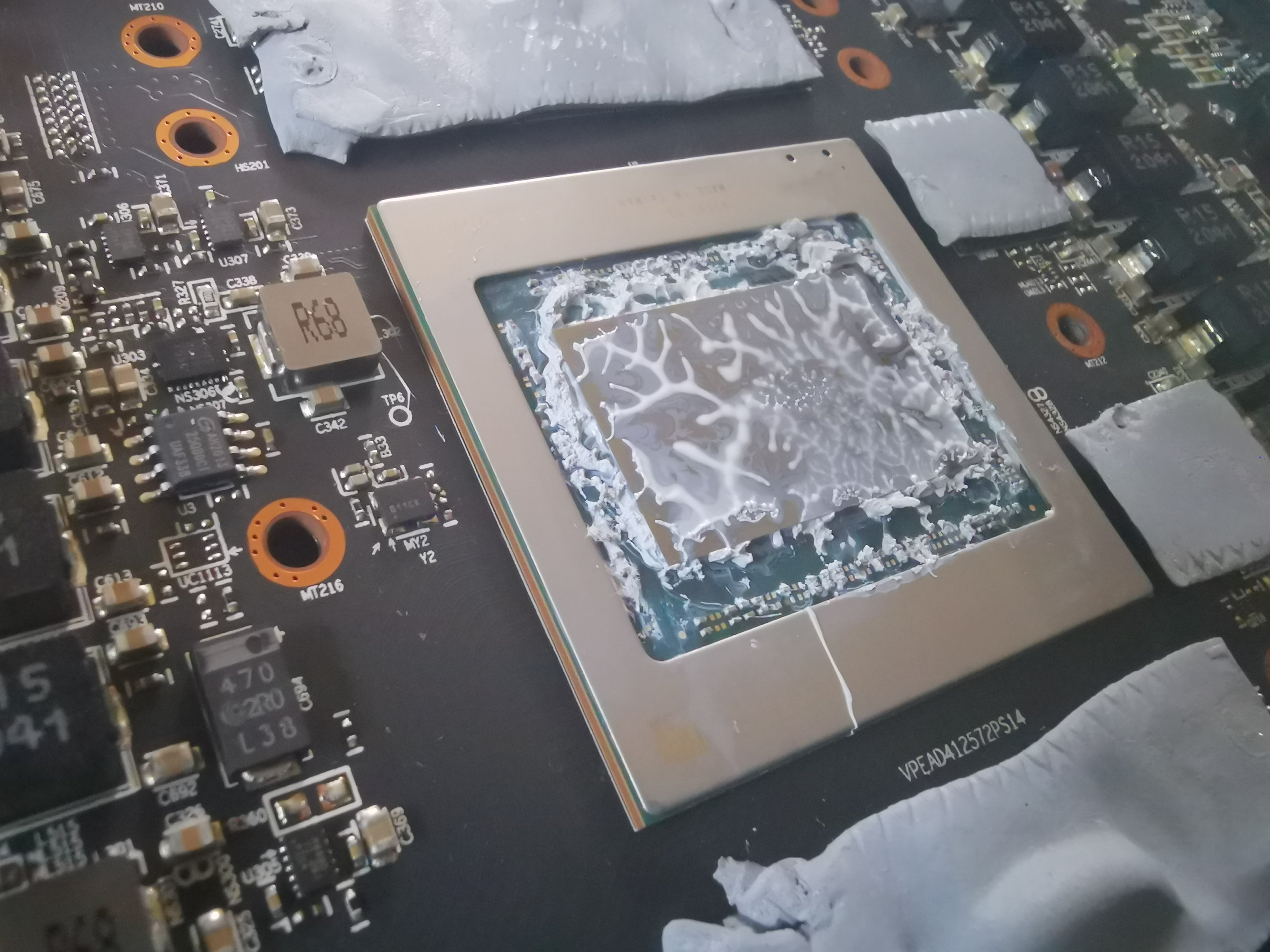 Jetzt muss man wissen.. das PAD ist genauso wie LM stromleitend.. da ich mir die Karte aber erstmal nicht mit Lack zuhauen wollte.. hab ich ringsherum um den DIE die ganzen metallkontakte mit normaler Wärmeleitpaste zugeschmiert (noctua NTH1.. bischen zähflüssiger als das Cryonaut.. hatte ich halt noch rumfliegen)