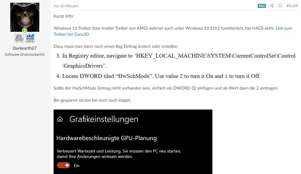 Leider weiterhin nicht. Selbst wenn man das in der Registry anpasst bleibt es bei Windows 11 weiterhin auf OFF, wie beim bisherigen WDDM 3.0 Treiber auch schon.GerryB schrieb:Kannst Du HAGS mit dem Treiber aktivieren
