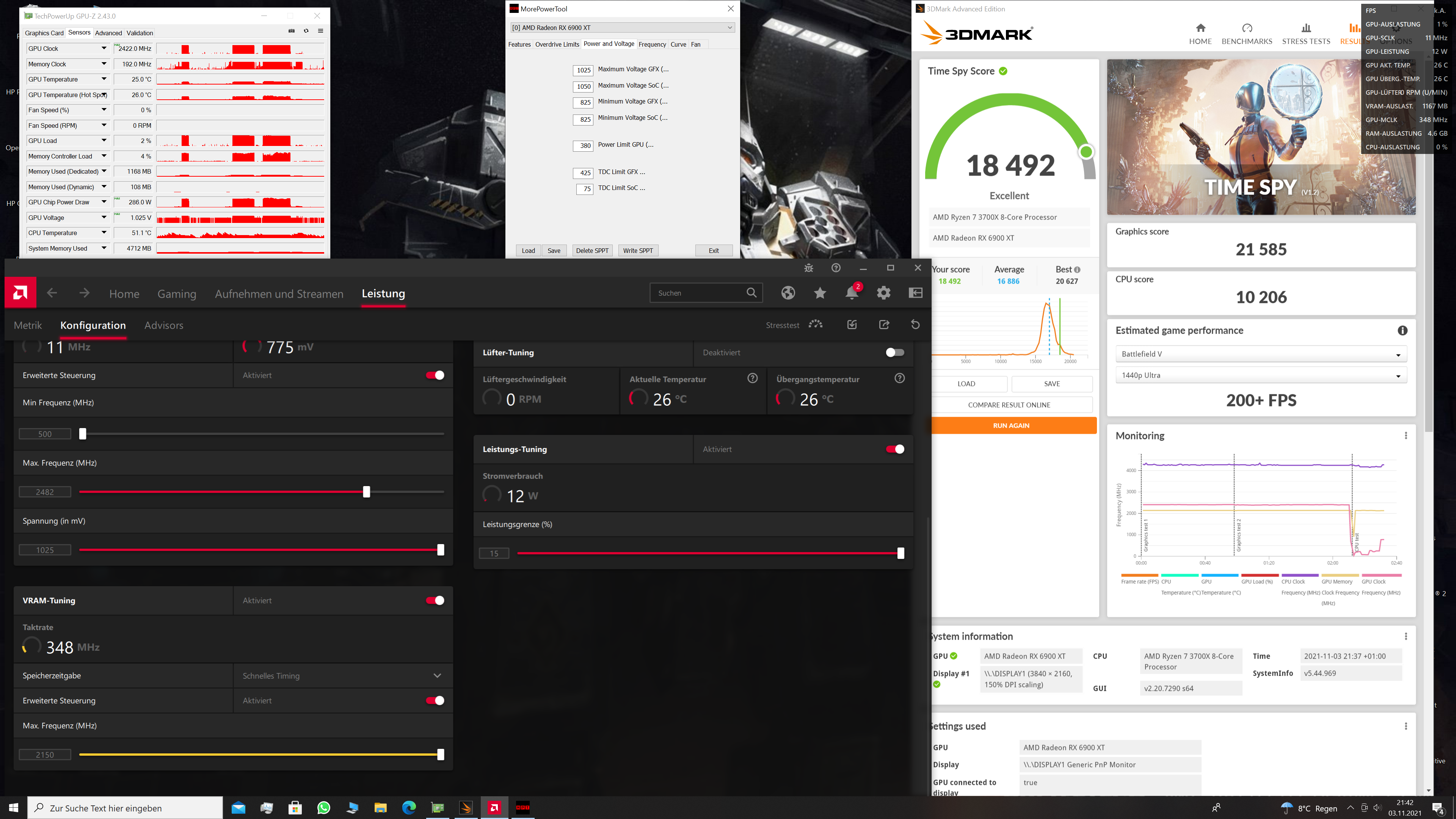 Nachher : Ram und GPU ĂŒbertaktet (6800 XT nur ganz leicht undervoltet und Maximalfrequenz angehoben / 85 Grad Hotspot Temperatur)