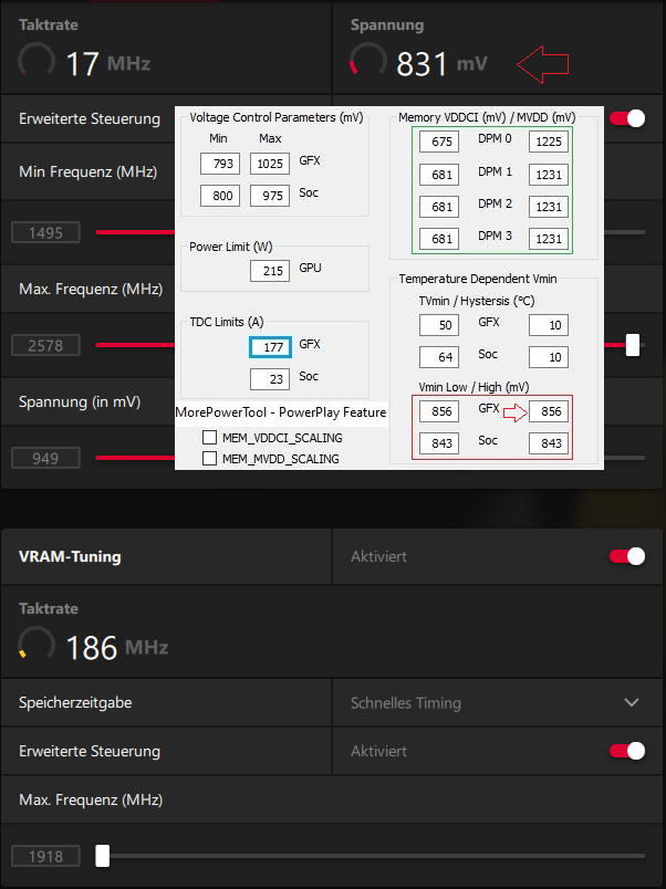 Im Wattmann ist es auf 1115mV eingestellt.Kommt dann ja hin;im MPT habe ich es belassen falls doch mehr gebraucht werden sollte,also wegen der gleichen Geschichte wie PL.Ardan Redburn schrieb:Mich wundert ja etwas das du mit 1175mV so weit kommst, Ich fahre bei 320W so um