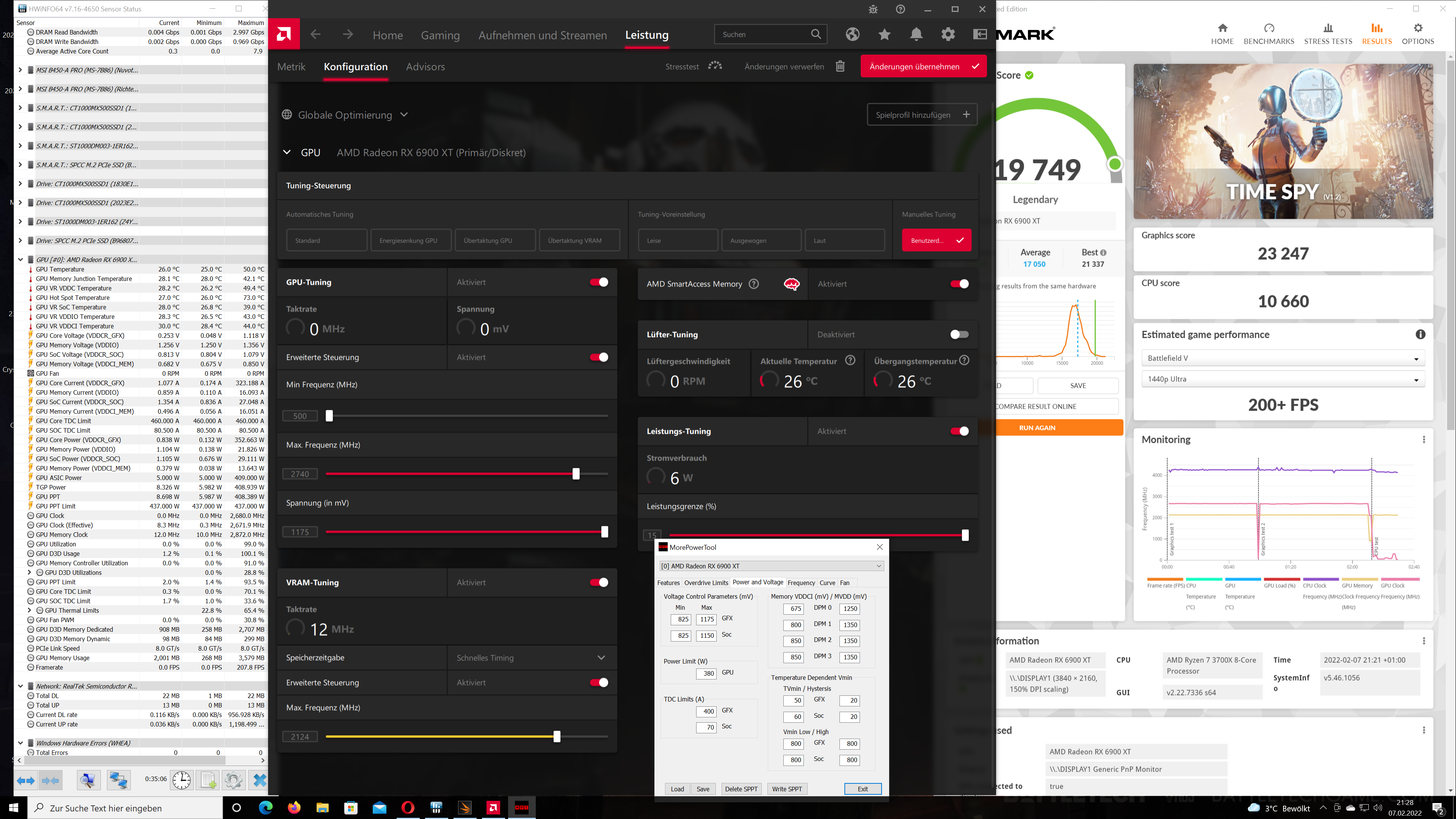 Ich habe mein bestes TimeSpy-Ergebnis (23K Grafikscore) mit weniger Takt, leichtem UV und 340W PL erzielt.