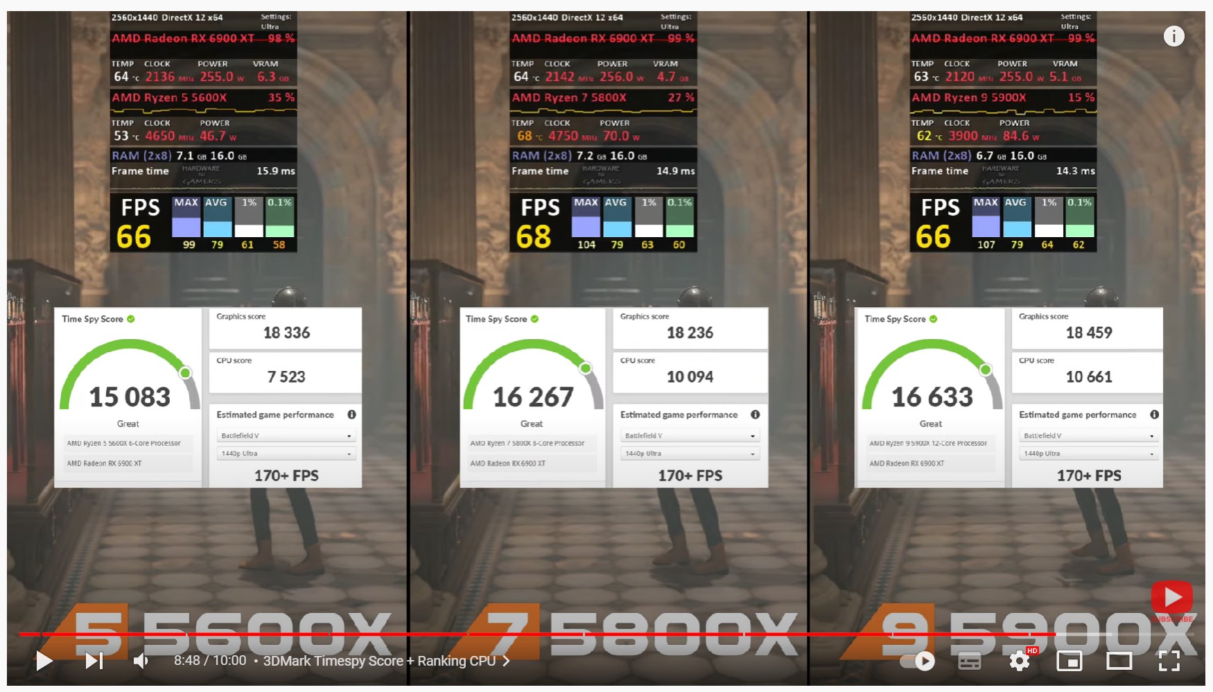 und in den beiden Videos wurde nur mit einer 3080 bzw. bei HUB mit einer 6800 non XT getestet und schau dir die Unterschiede zu deinem R5 3600 an, die 6900XTU ist da nochmals ne ganze Ecke schneller unterwegs mit deinen fast 22K Timespy Punkten