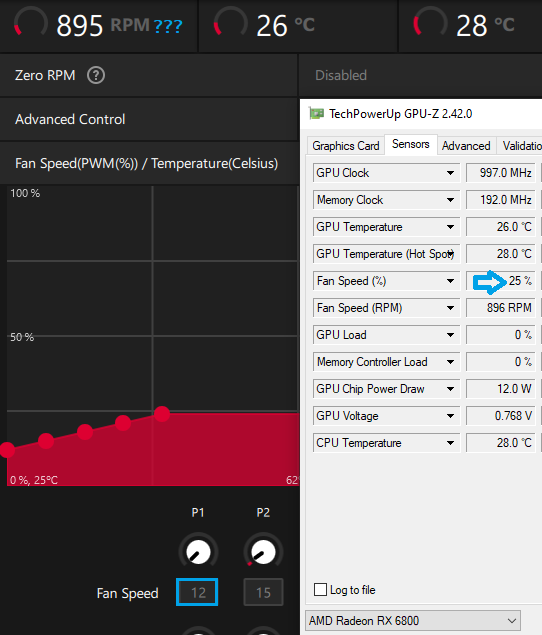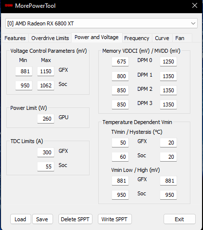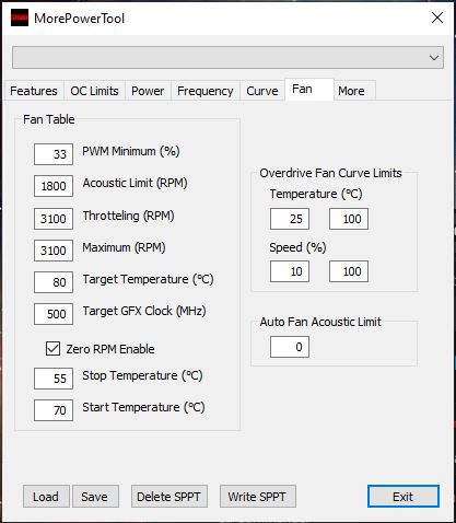 MPT nehme ich nur, um minimum RPM auf 25% zu setzen, damit ich ohne zero-rpm-mode dauerhaft leise 500rpm einstellen kann. Dann ist GPU im idle bei ca. 40° und aufheulen der Lüfter bei zero-rpm ist weg. Ohne MPT kann man im Wattman nur auf 30% runter, das sind dann 1000rpm und zu laut für idle.