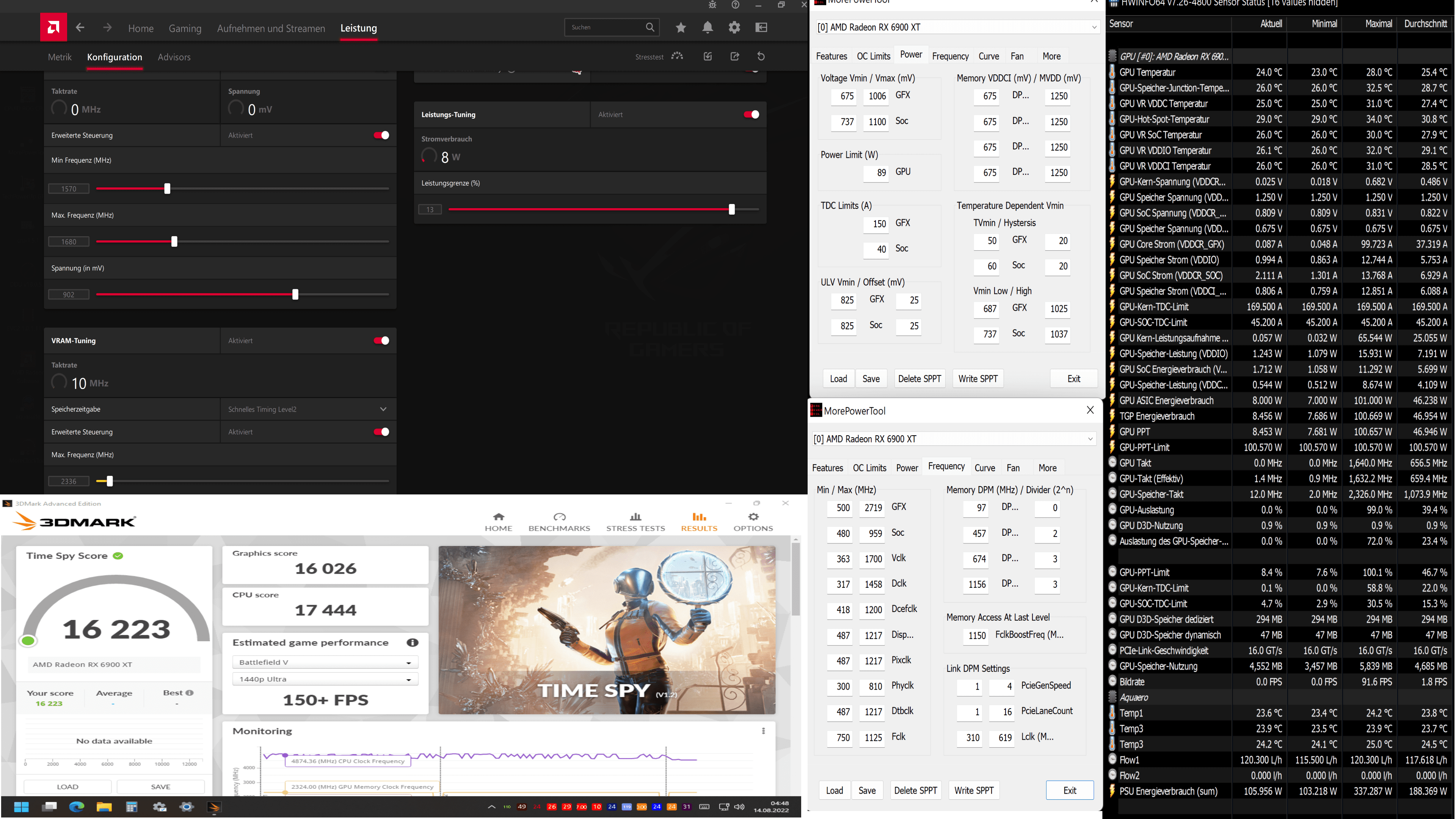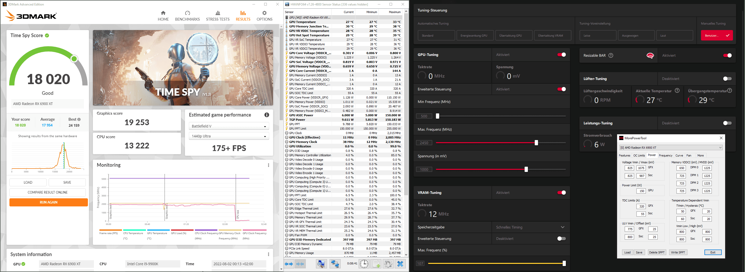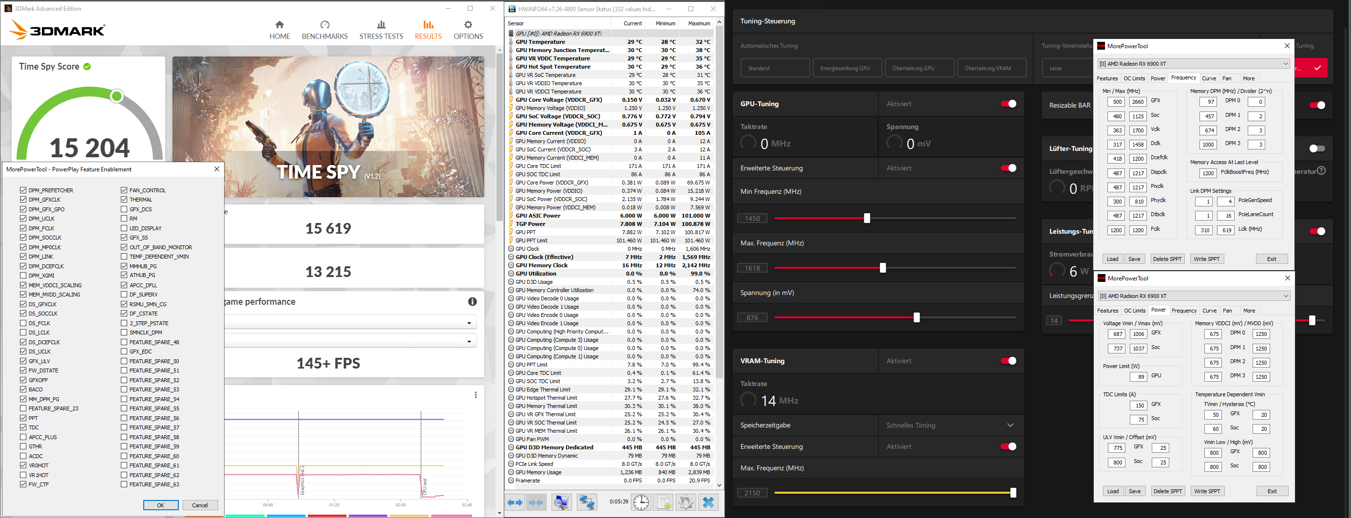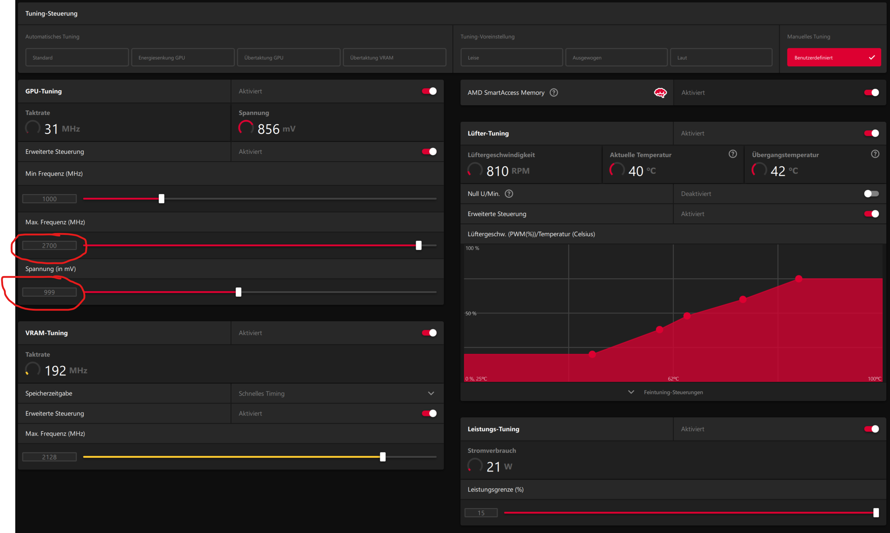 VRAM hab testweise auf 2150 gestellt, da aber direkt 400 Punkte weniger als bei 2112. Daher bin ich da wenig optimistisch, dass da noch viel "geht", wenn ich schon an der Korrekturgrenze bin. Stromverbrauch SoC und VRAM sind ja bei uns beiden nach Screenshot eh identisch im Maximalwert.