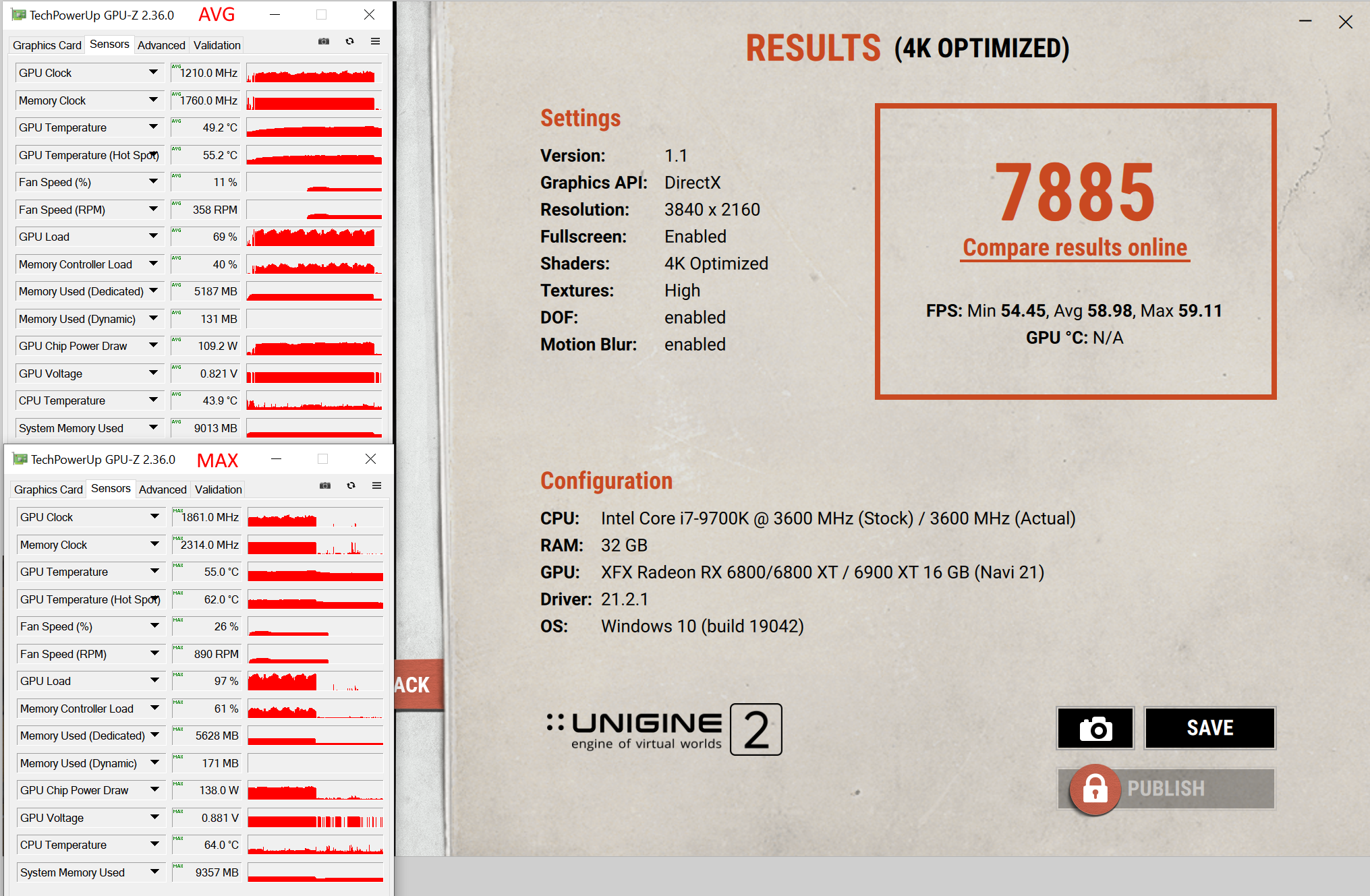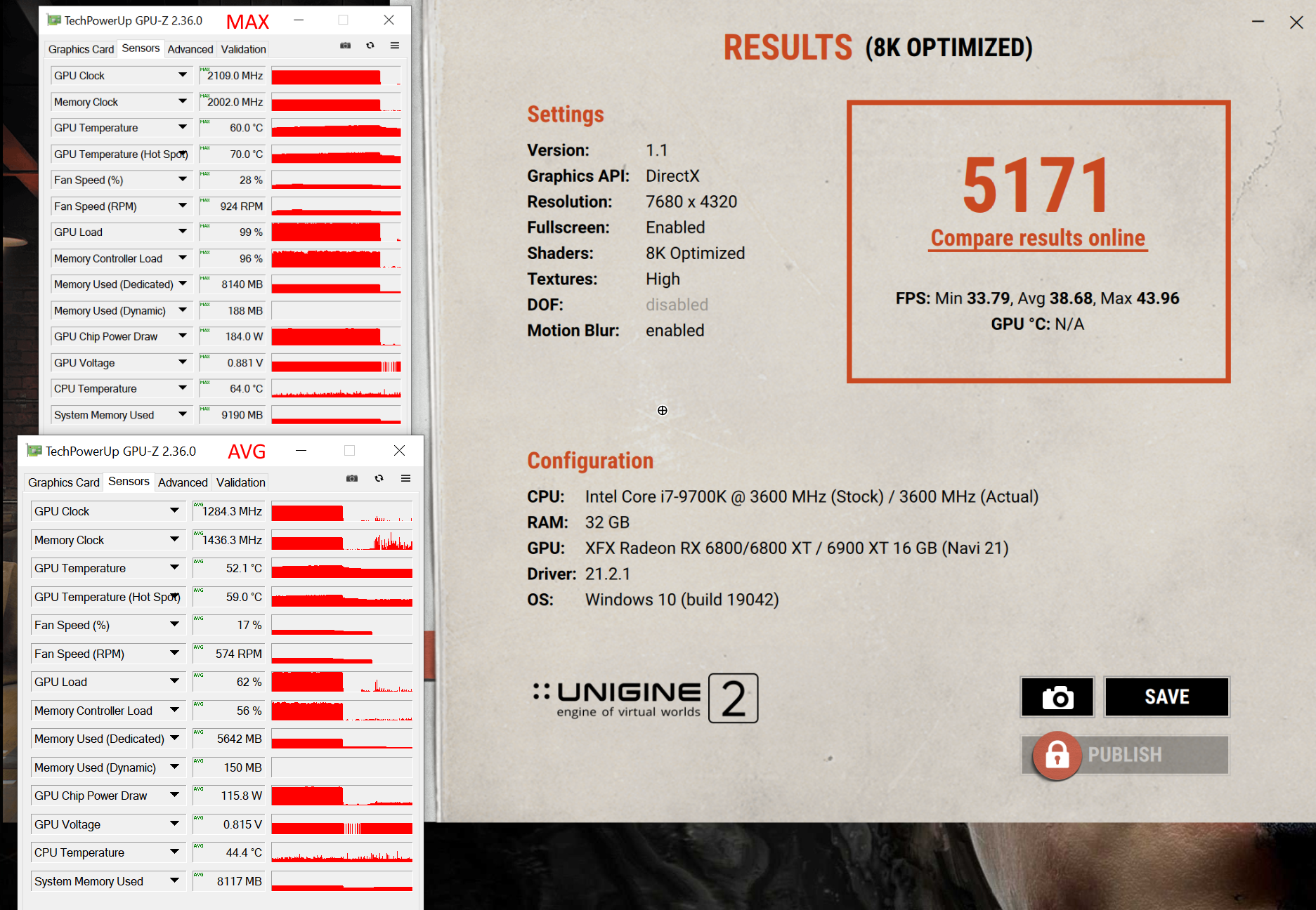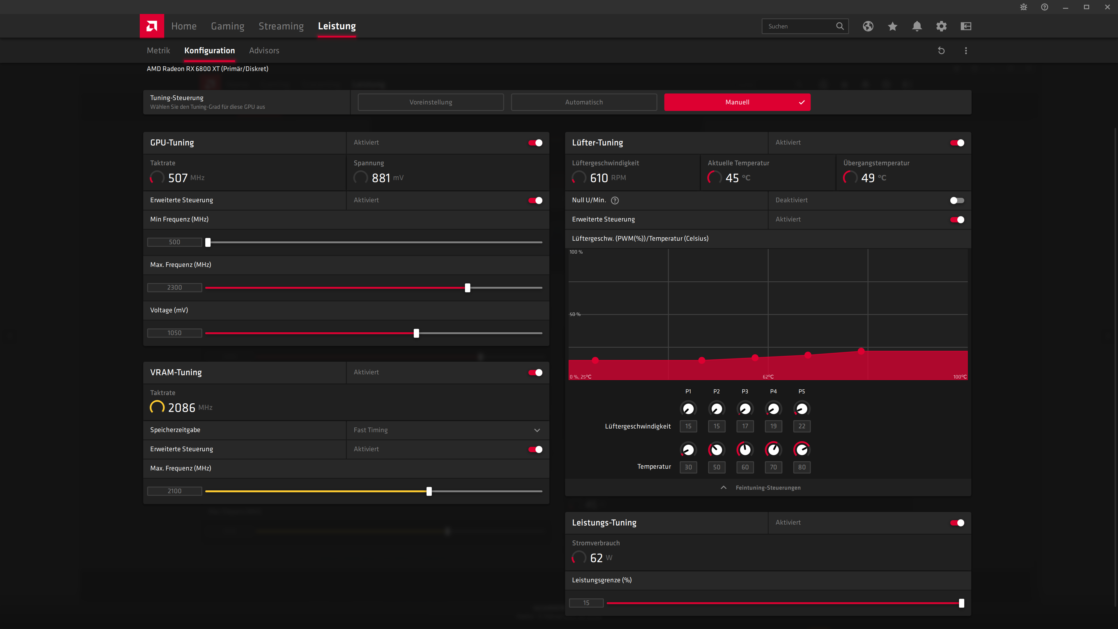 Sapphire RX 6800 XT 0,881V @ 2195MHz @ 170W. Real pendelt der Takt zwischen 2130-2170MHz. Die Spannung bleibt konstant. Bei Werten über 2200MHz stürzt der Treiber regelmäßig ab.