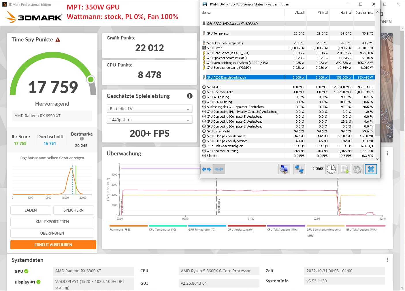 92°C Hotspot ist unproblematisch. Solange du klug genug bist, die Lüfter in solchen Tests auf 100% zu lassen (und das Netzteil Luft dafür hat), könntest du auch 400 W durchjagen, sofern die Karte in Time Spy einen Takt akzeptiert, der so viel Leistung fordert. Selbst bei 115 Grad Hotspot könntest du den Zeigefinger in den Schoß legen, denn schlimmstenfalls schaltet sie ab. Dafür haben die Karten interne Schutzmechanismen.bttn schrieb:Ich bin deinem Hinweis gefolgt und habe mal die 350W im MPT laufen lassen mit 0% PL.