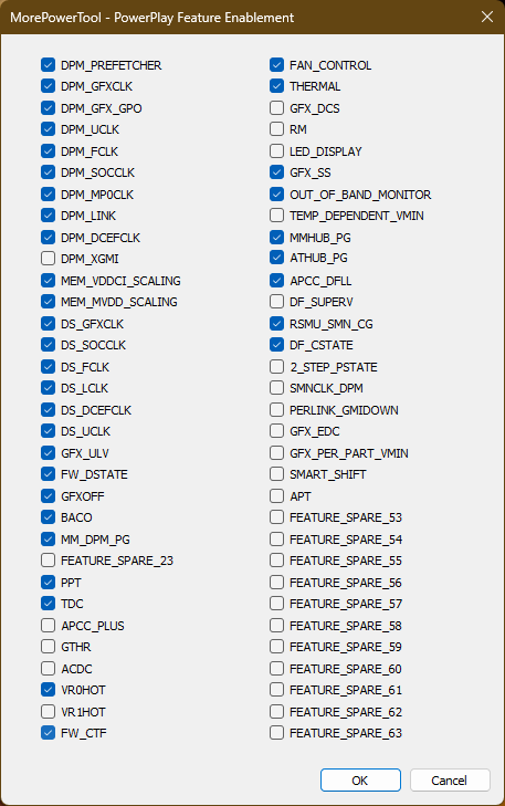 Als ich wegen fehlender GPU-Last in TS mal nicht mehr weiter kam, hat es geholfen, Stromsparmechanismen der Karte abzuschalten. Das geht in "Feature Control" des MPT. Links default, rechts Test.Shir Khan schrieb:willst du noch etwas tiefer einsteigen, um sicherzugehen? Dafür bräuchten wir dann aber das MPT im Einsatz.