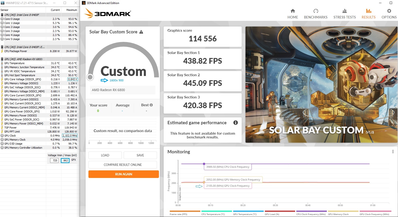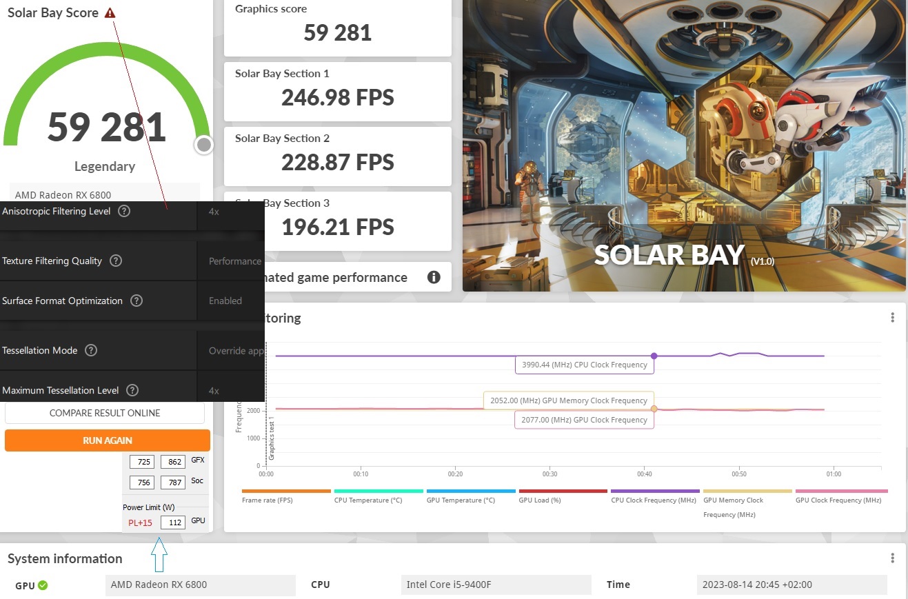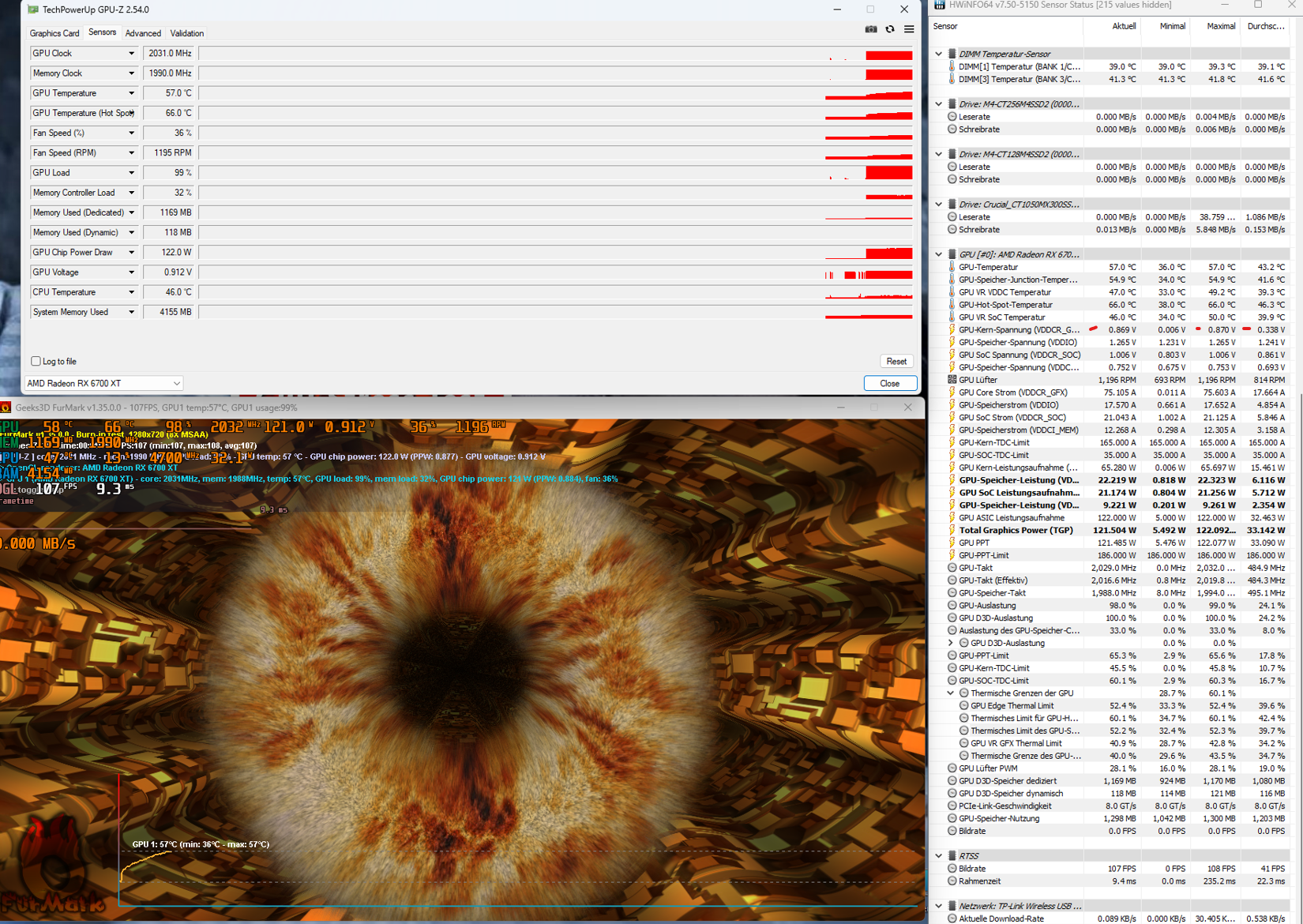 Ich habe Asus 6700 XT Dual und CPU AMD 5600. Ich spielte mit GPU Undervolting AMD Software Adrenaline Edition und FurMark (Preset 1080 FHD, fullscreen, AA 0xMSAA, 10000ms).