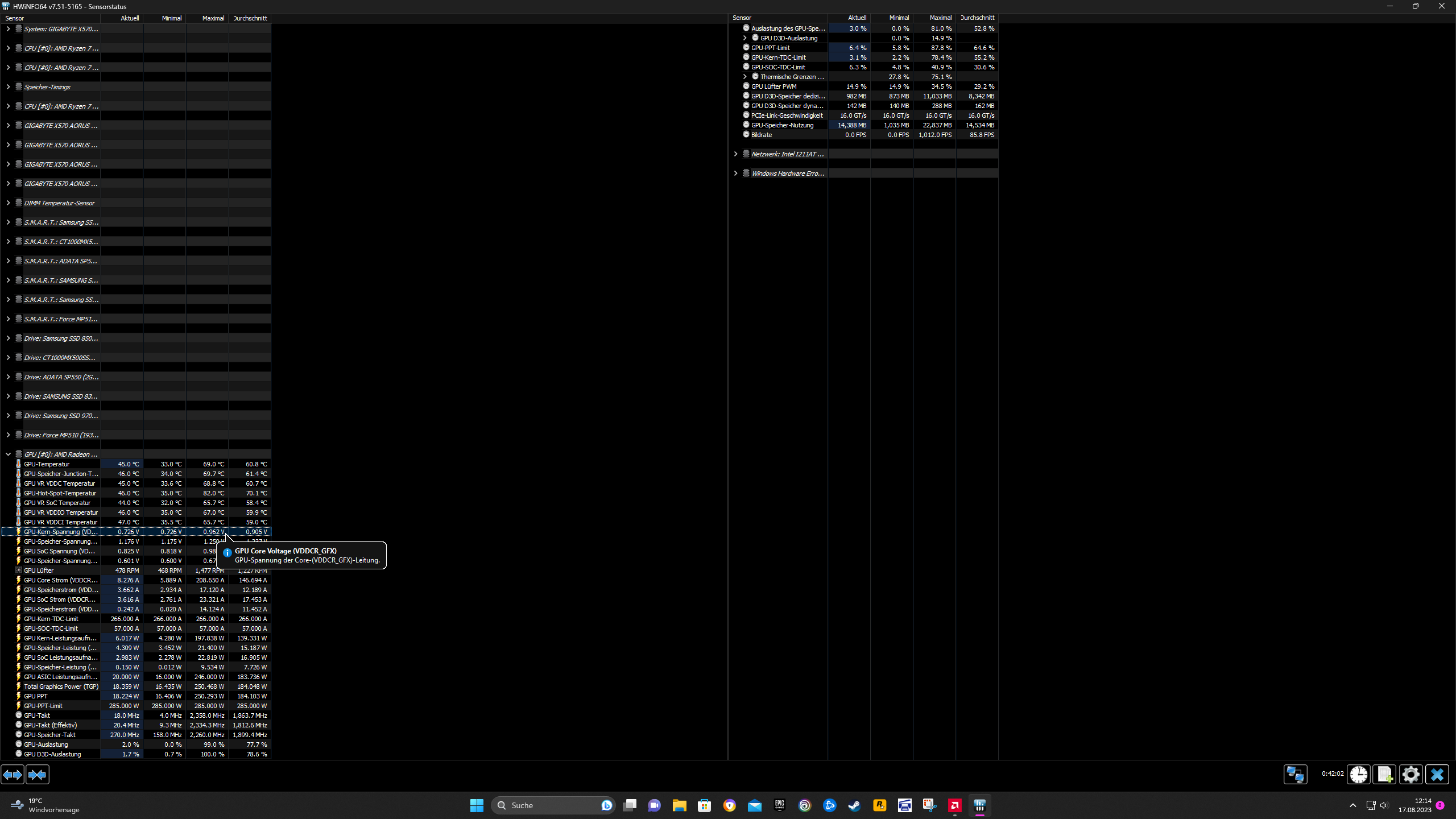 Während der AB und GPUZ gleich 0,91V anzeigen, zeigt HWinfo64 (0,87V) weniger GPU Vcore an.