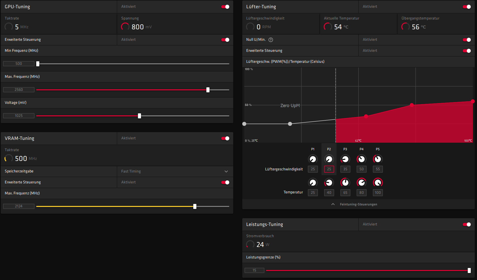 Speziell die letzten zwei Werte funktionieren so gut, dass ihr damit höhere Takraten erhaltet, der Verbrauch der Karte jedoch überproportional steigt und speziell bei schwächeren Netzteilen