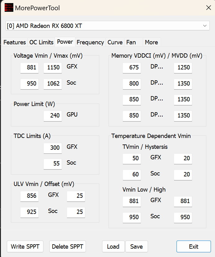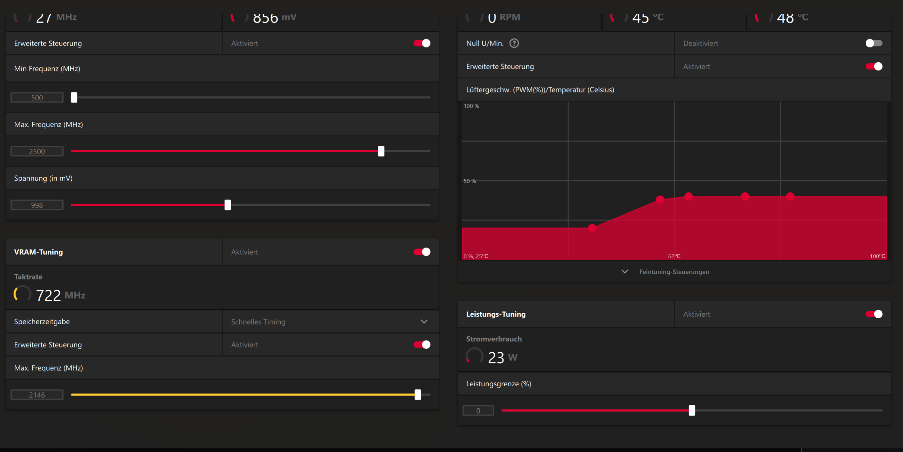 Asrock RX 6900 XT OC Formula. Ich denke ich werde noch die mV auf 900 drĂŒcken. Watt verbrauch lag bei um die 150 Watt.