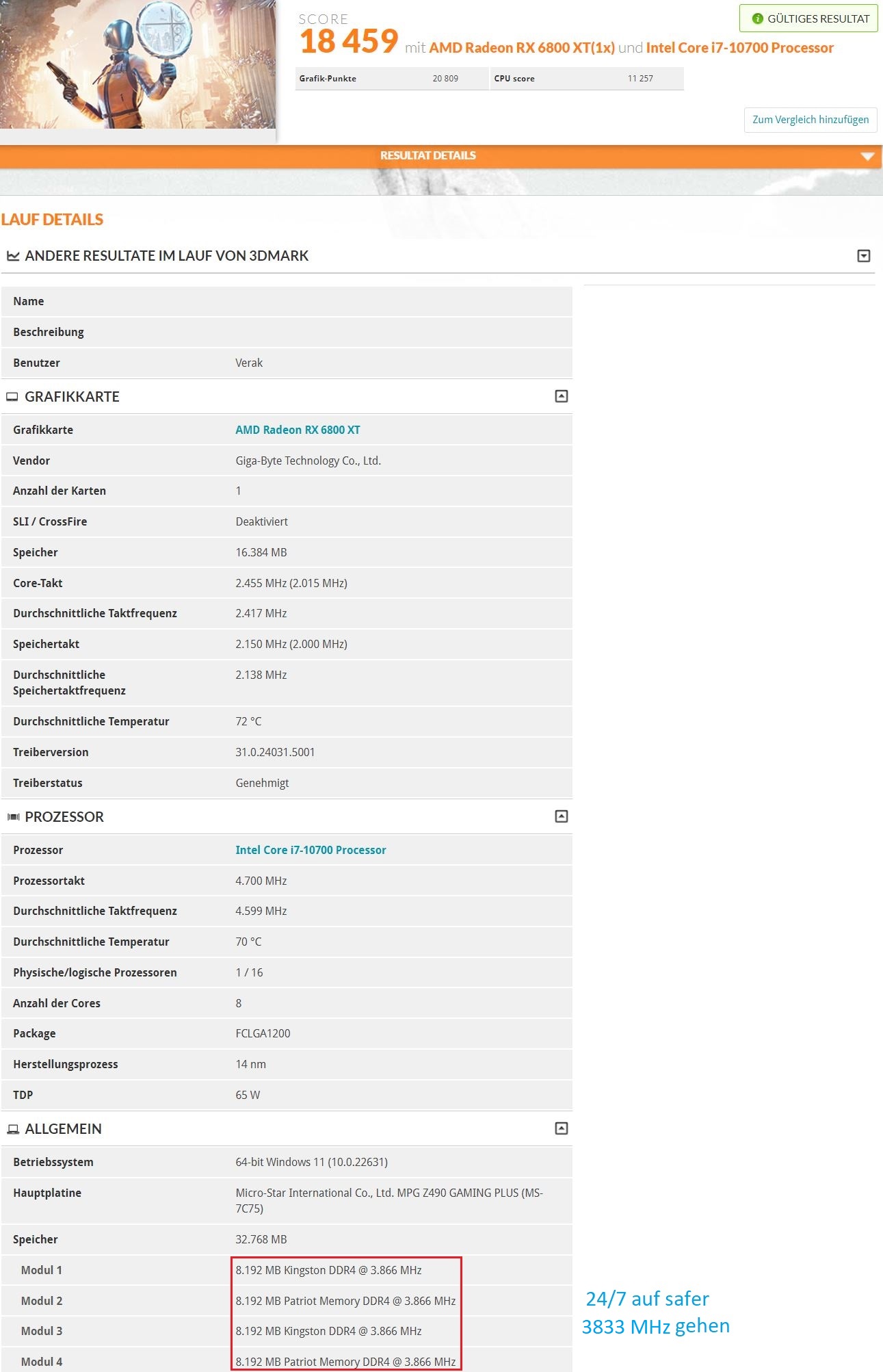 hatte ich alles mit Memtest schon durchgetestet und hab da bis dato keine Probleme gehabt, Ram läuft wunderbar mit 1.43v, hatte versucht noch schnellere Timings meines Patriot Viper anzugleichen bzw. auf CL16 runter zugehen, hat er aber nicht mitgemacht, selbst mit 1.475v nicht und höher wollte ich net gehen auf DauerGerryB schrieb:24/7 würde ich Dein RAM-OCen ein mue von 3866MHz auf 3833MHZ runter nehmen.