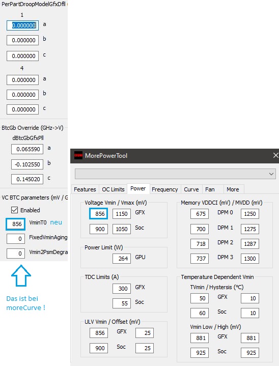 Servus. Bin neu beim Thema und grad am undervolten meiner rx6650xt. hab im mpt die max core voltage gesenkt weil der regler im wattman ja soweit ich das verstanden hab nur einen offset auf die voltage frequency curve haut. Jetzt die Frage: Was stellt man eigentlich ein wenn man im Wattman die maximale Taktrate verändert? ist das ebenfalls ein offset auf die voltage frequency curve? Weil wenn es einfach eine Schranke wäre müsste es ja egal sein was man als max takt einstellt. Die Taktrate würde dann ja von der Voltage abhängen. Offensichtlich ist es aber so, dass sich bei veränderung der maximalen taktrate auch die taktrate bei gegebener Spannung erhöht.
