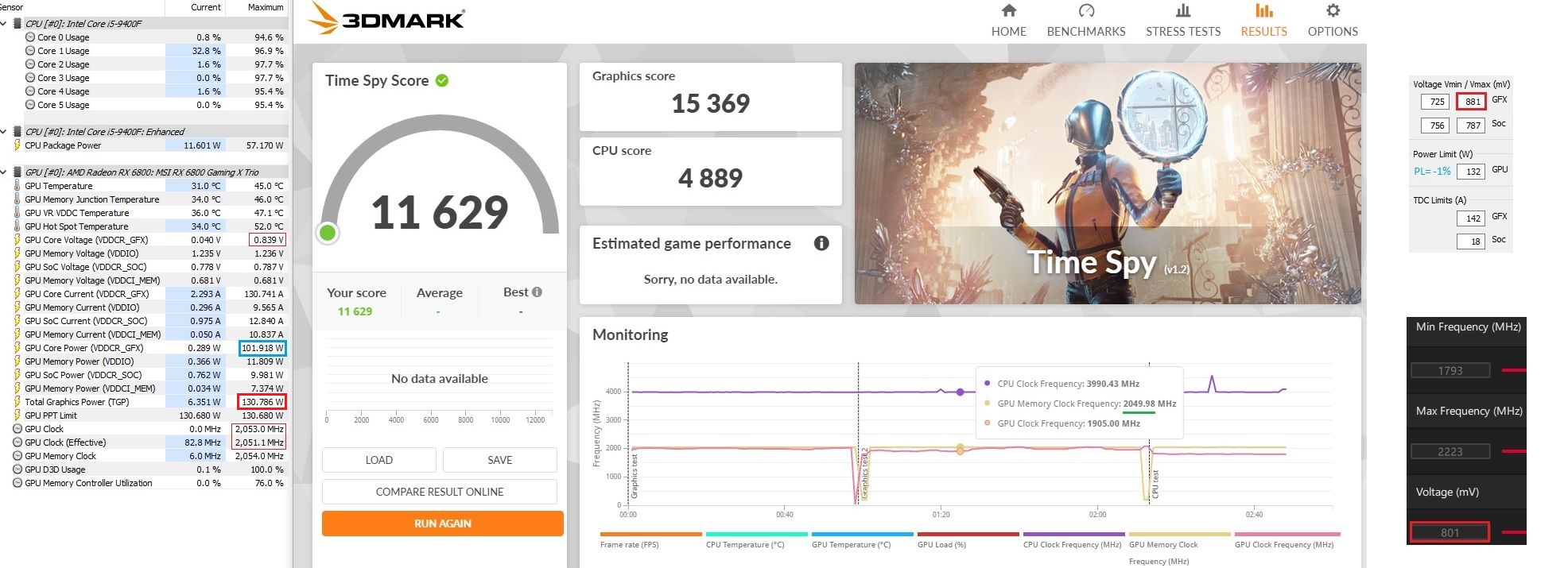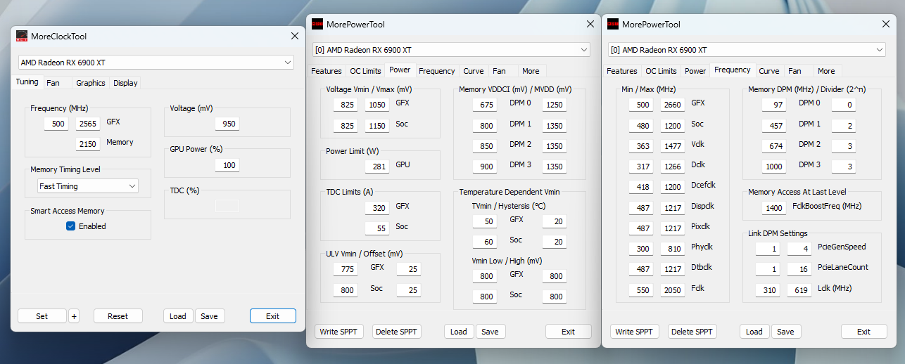 @GerryB Is there anything I did wrong with the SOC undervolt? For some reason, I can't get it stable. At default voltage, the highest clock I can achieve is 2200 MHz on the FclkMax without any display dropouts, but whenever I try to undervolt, it'll crash after maybe an hour and a half of in-game playtime. My Vram, I suspect, is degrading since I can only undervolt stably to pass a benchmark but not in game. Previously, I was able to achieve 2150 FT2 with a minimum voltage of 650 mV/1250 mV, but now I have to put 900 mV/1350 mV in order to have 2150 FT1 stable. I can hit the 2660 MHz Fmax of my card at 1.1 volts for the core, which pulls around 260 watts in superposition but requires too much power in Timespy for a higher score than the one attached below at 1025mv with an Fmax of 2500 MHz (effective 2440 MHz). You seem to be the most knowledgeable and active in the Navi2x efficiency space, so any help would be greatly appreciated. The settings I'm currently running are in the second attachment, the first being the highest score I was able to achieve (I am running a Gaming X Trio as well, and the cooler maxes out at the 280w default)