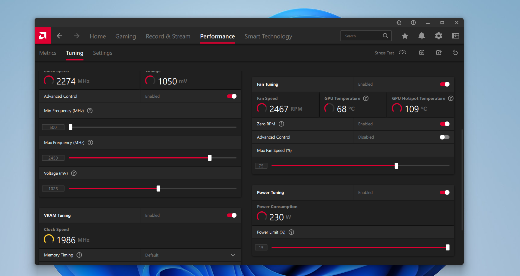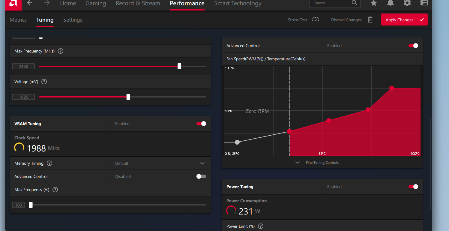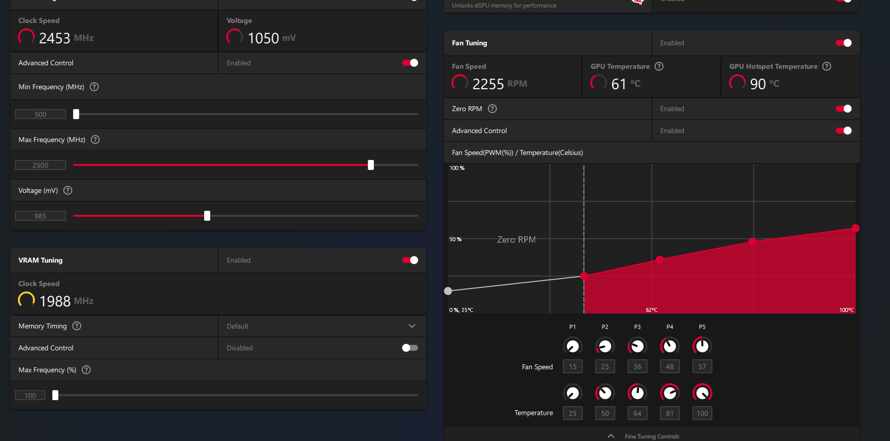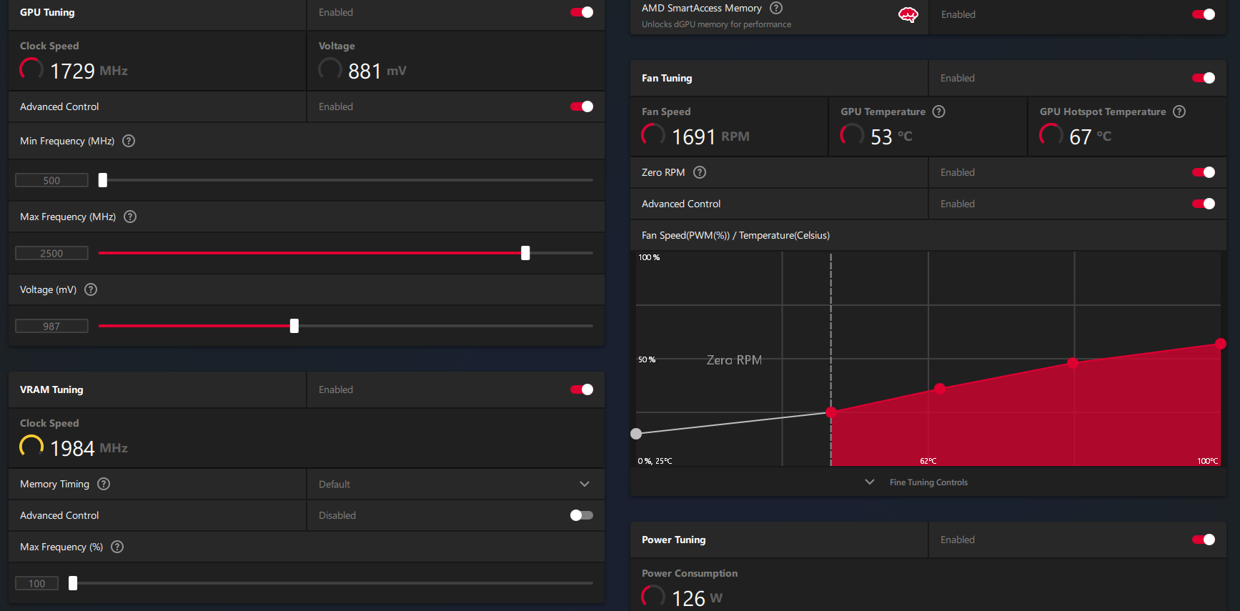 guten morgen leute habe mir eine xfx speedster swft 319 6800 xt geholt... habe versucht undervolting zu machen und bis jetzt bin ich auf 1025mv und 2450mhz (bin auch auf 990mv und 2500mhz runter gegangen läuft auch) habe rdr2 versucht und läuft stabil bis jetzt... aber die fans sind zu laut würde gerne jetzt die fan curve auch einstellen irgendwie ist die fan curve zu agressiv...