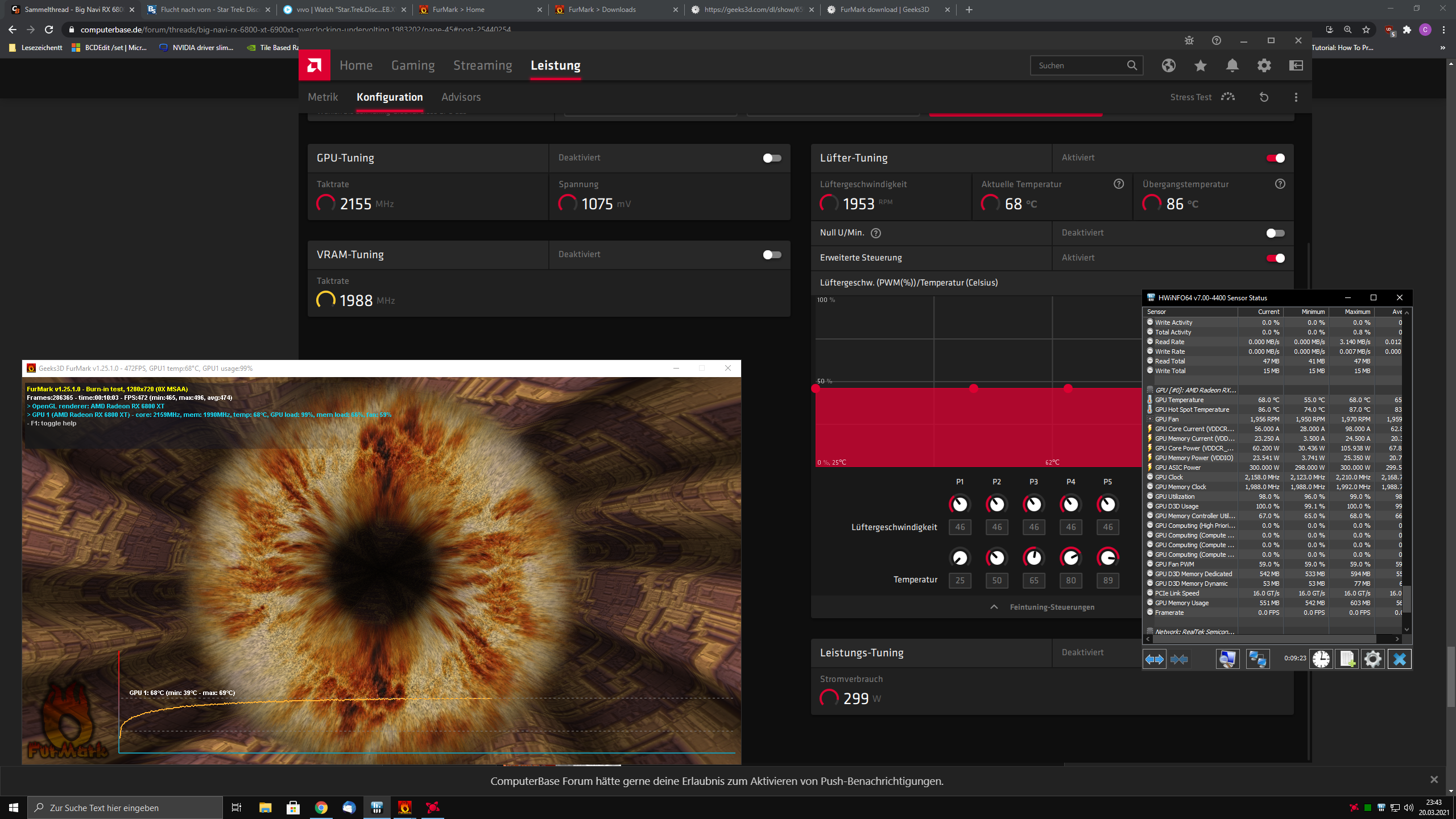 ergebniss sind 68 GPU und 87 Hotspot auf 300 watt @1970 RPM bei 10 min Furmark