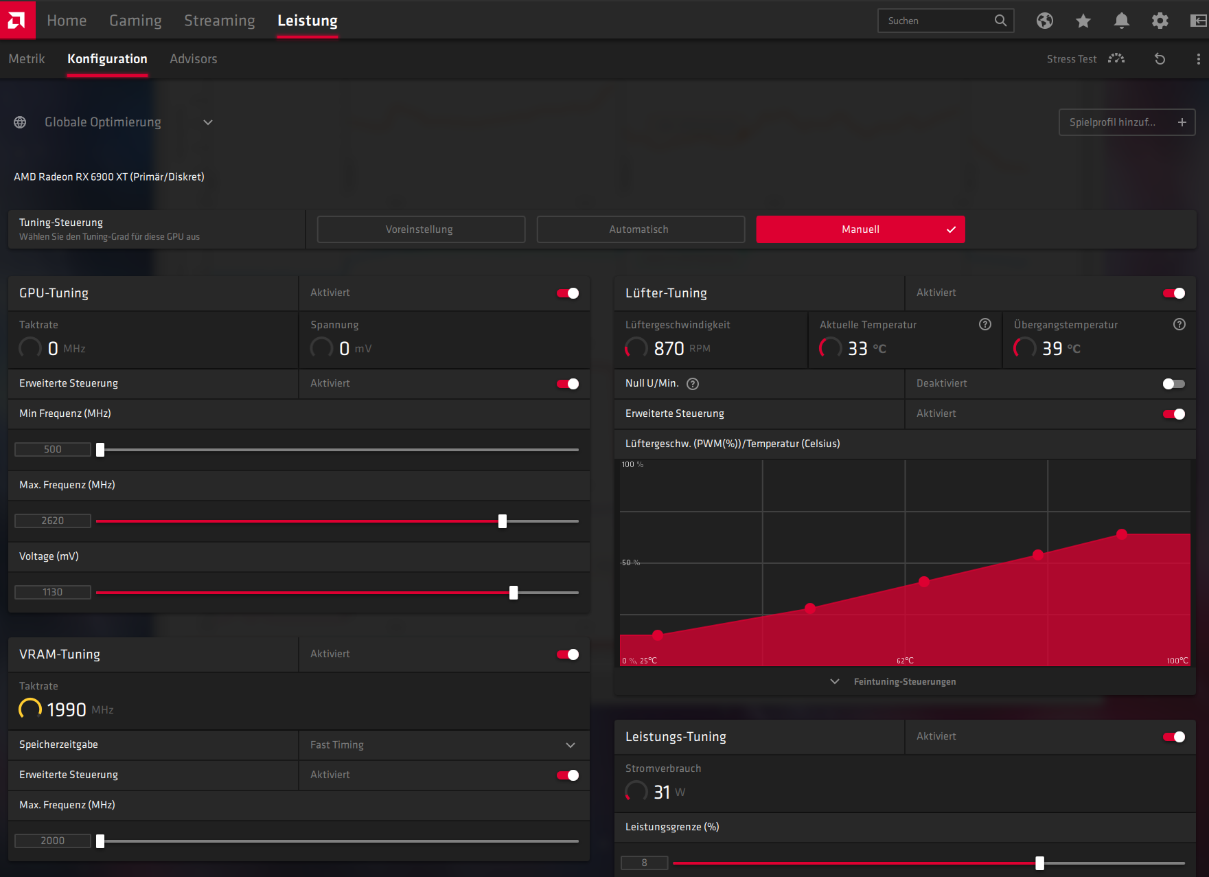 CPU UV ist zwar sinnvoll,da mit aktuellen CPU Leistung satt fürs Gamen aber meine GPU wollte ich jetzt nicht so kastrieren,da kann ich mir doch gleich eine Kleinere kaufen.Wieso sollte ich jetzt eine 6900XT auf 6800 Leistung stutzen um vielleicht 50 Euro Strom im Jahr zu sparen.Klar kann man sich so ein Profil erstellen wo die Leistung nicht gebraucht wird aber i.d.R. kauft man sich die Karte ja eben weil man Leistung braucht.