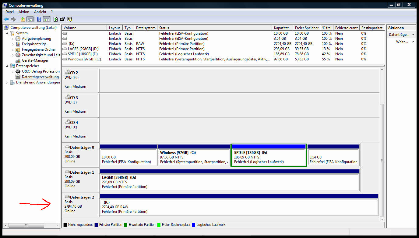 in der windows datenträgerverwaltung wird eine partition von 2,79TB angezeigt, aber eben unformatiert.