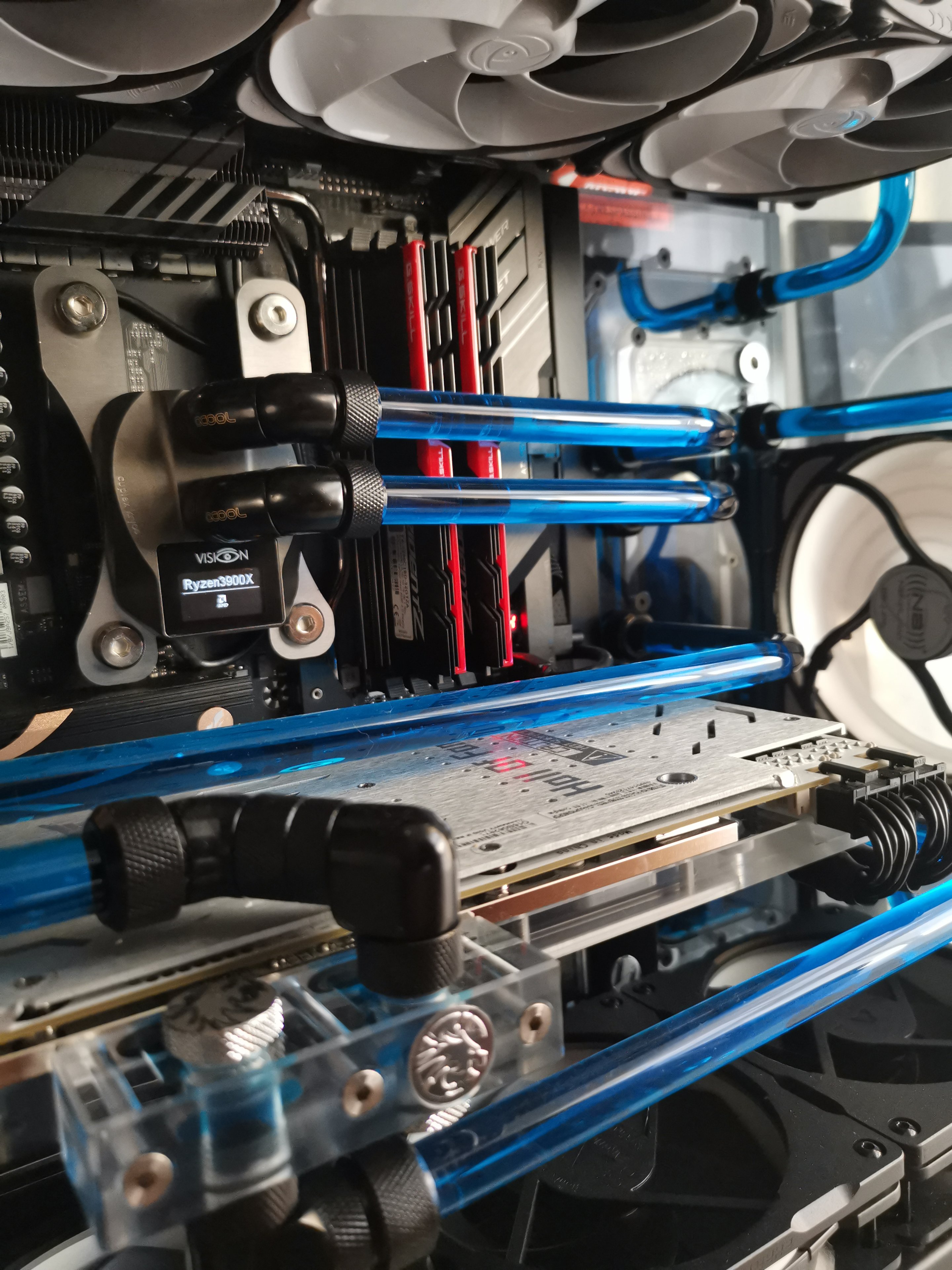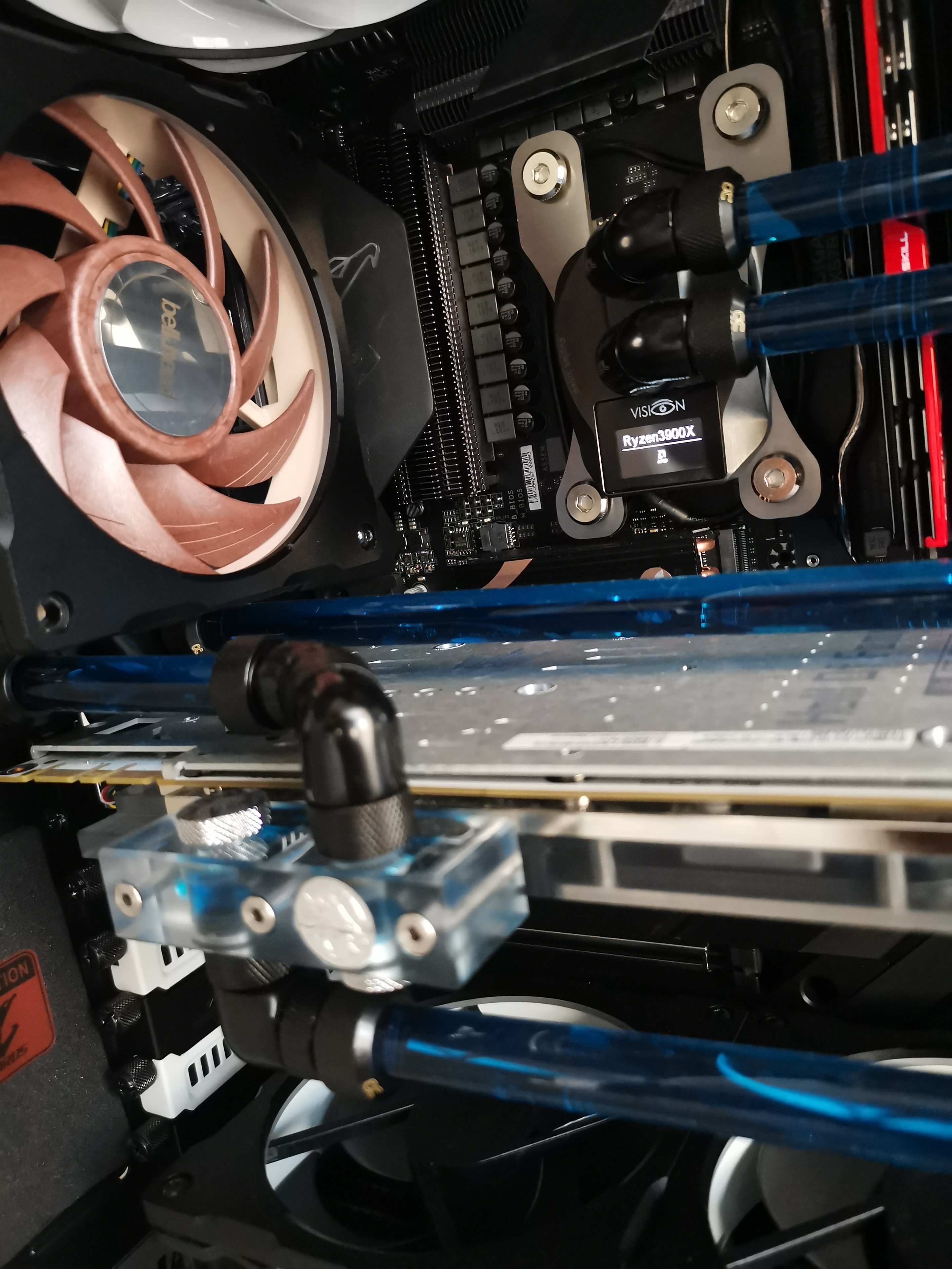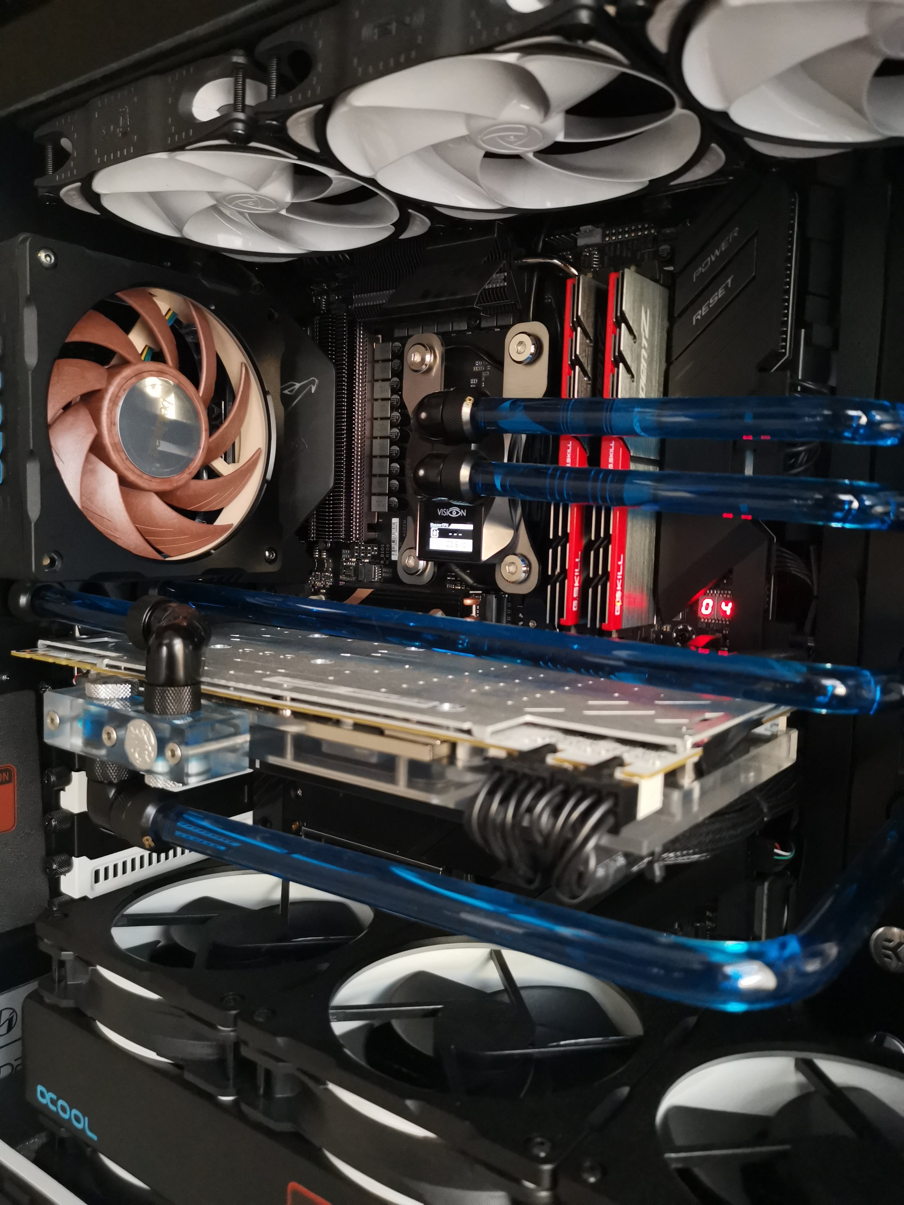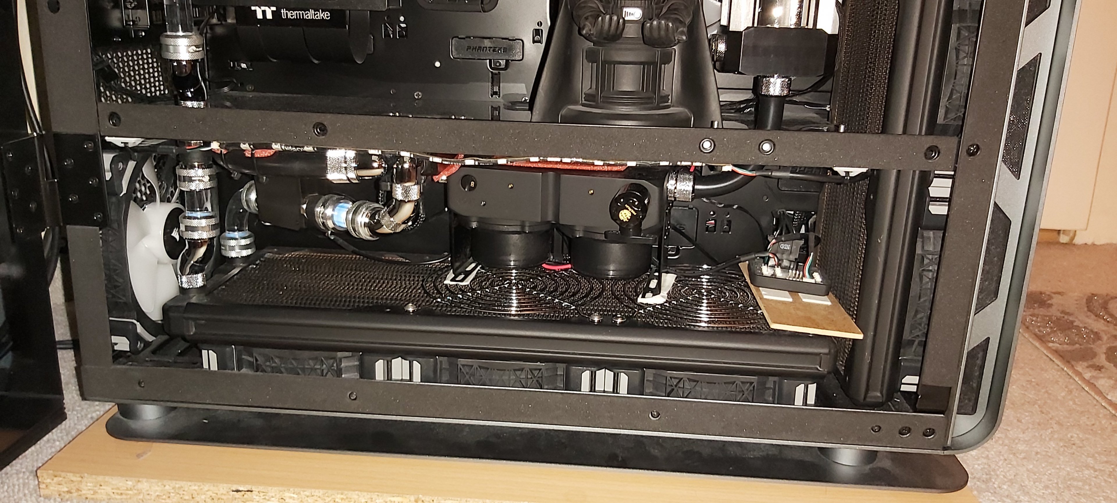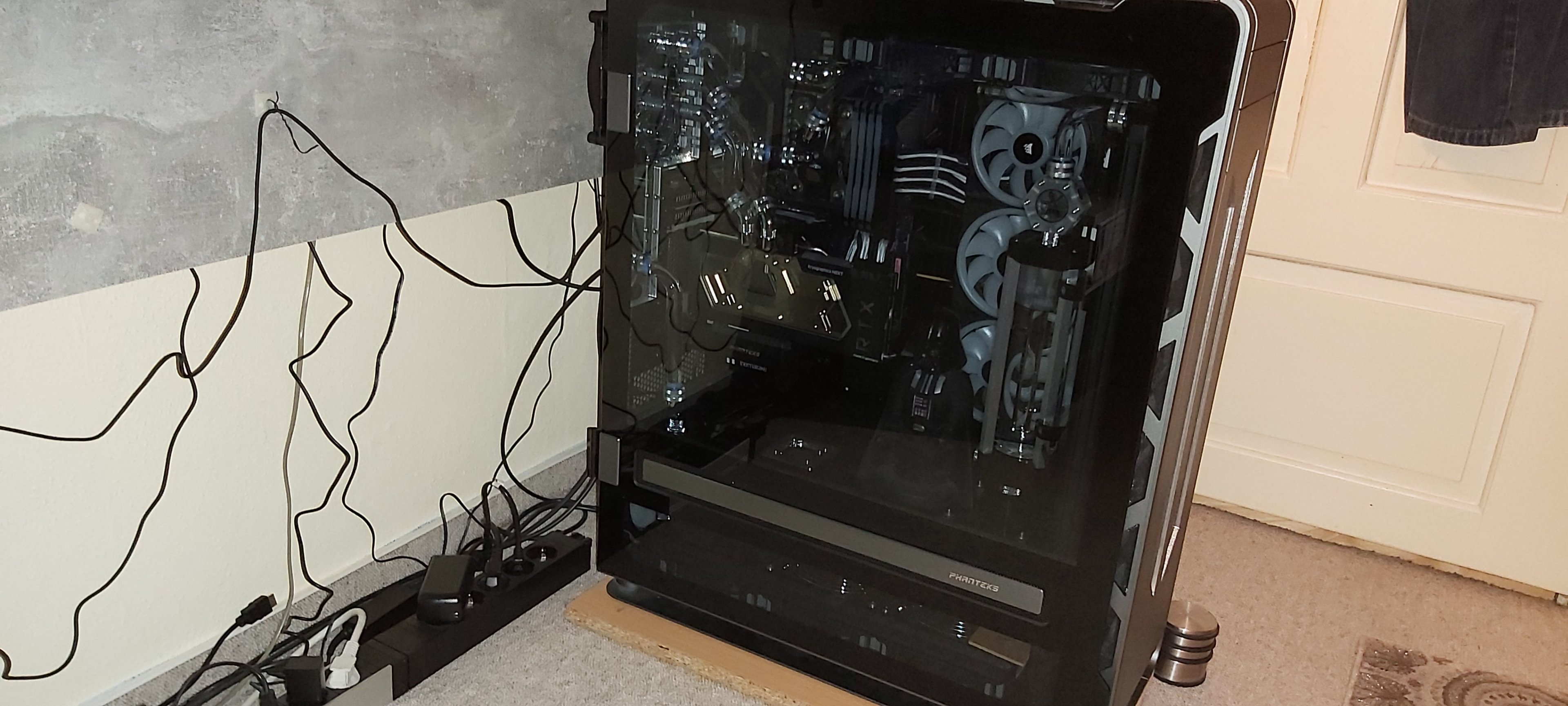 Daher frage ich hier einfach mal nach, ob jemand bei sich Zuhause einen PC mit custom Wasserkühlung hat und vielleicht ein Bild zur Verfügung stellt. Ich kann euch auch als Urheber im Impressum verlinken, falls ihr das wollt. Was ich mir etwa vorstelle, könnt ihr auf dem Bild sehen, Abweichungen sind aber natürlich auch willkommen.