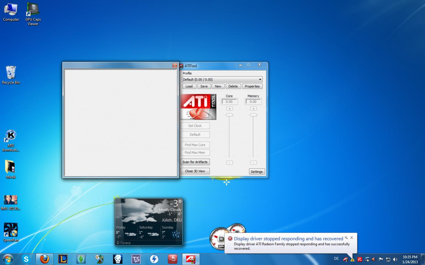 ja es liegt and der grafikkarte ... hab ein anderes programm benutzt ... ATITool .... hat ein 3D bild von einem fell gezeigt , das sich ganze zeit gedrecht hat und konnte nicht mal bis 2 zählen und schon ging es los ... schwarzes bild , lüfter dreht durch ....