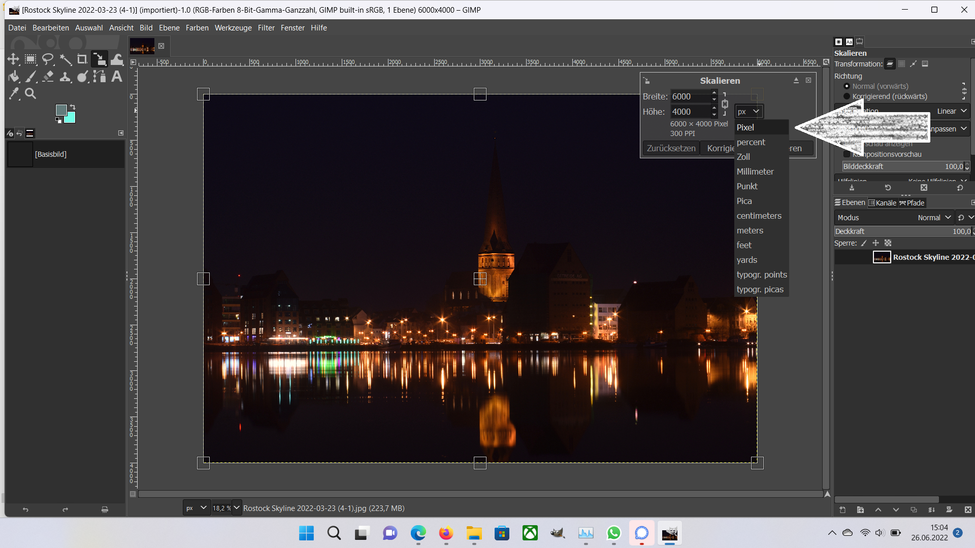 Hallo, ich stehe gerade etwas auf dem Schlauch. Ich möchte ein Bild in Gimp verkleinern, jedoch nicht die Größe in MB, sondern das Bild an sich, so dass es auf eine Tasse gedruckt werden kann. Wenn ich das Bild über "Bild->Bild skalieren" auf z.B. 50% setze, dann bringt das nicht den gewünschten Effekt, das Bild ist dann im Bildbetrachter nach dem Exportieren und auch auf den diversen Seiten wo man eine Tasse zum Druck online gestalten kann immer noch dieselbe (zu große) Größe. Eine direkte Verkleinerung des Bilds ist bei der Software diverser Anbieter leider nicht möglich, also muss dies vorher erleidgt werden.