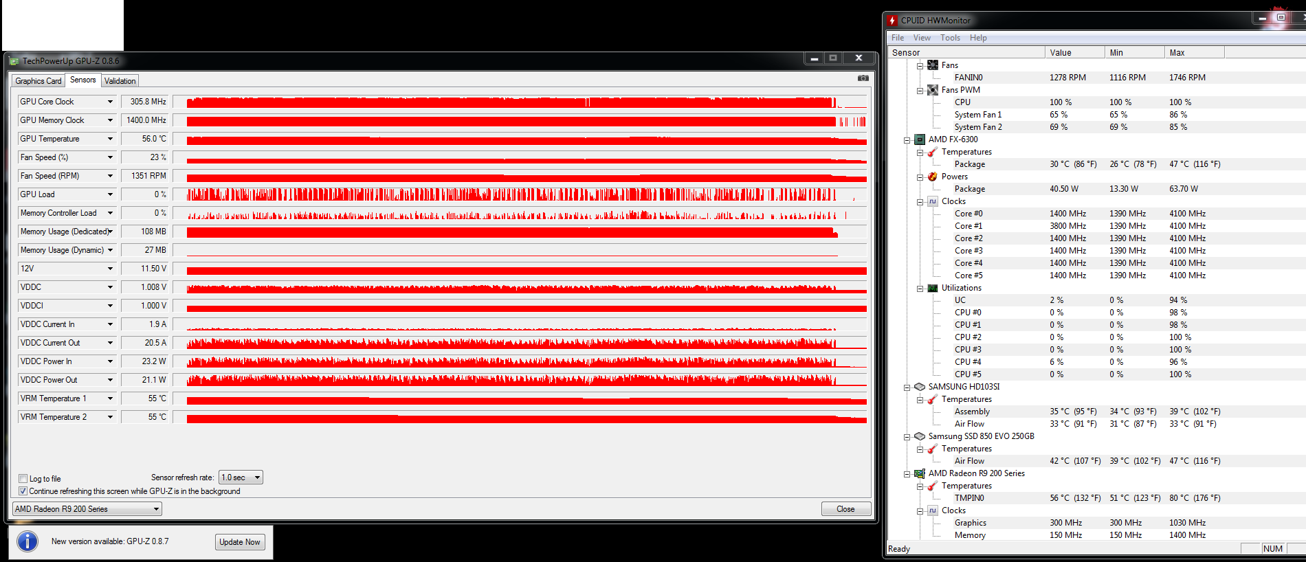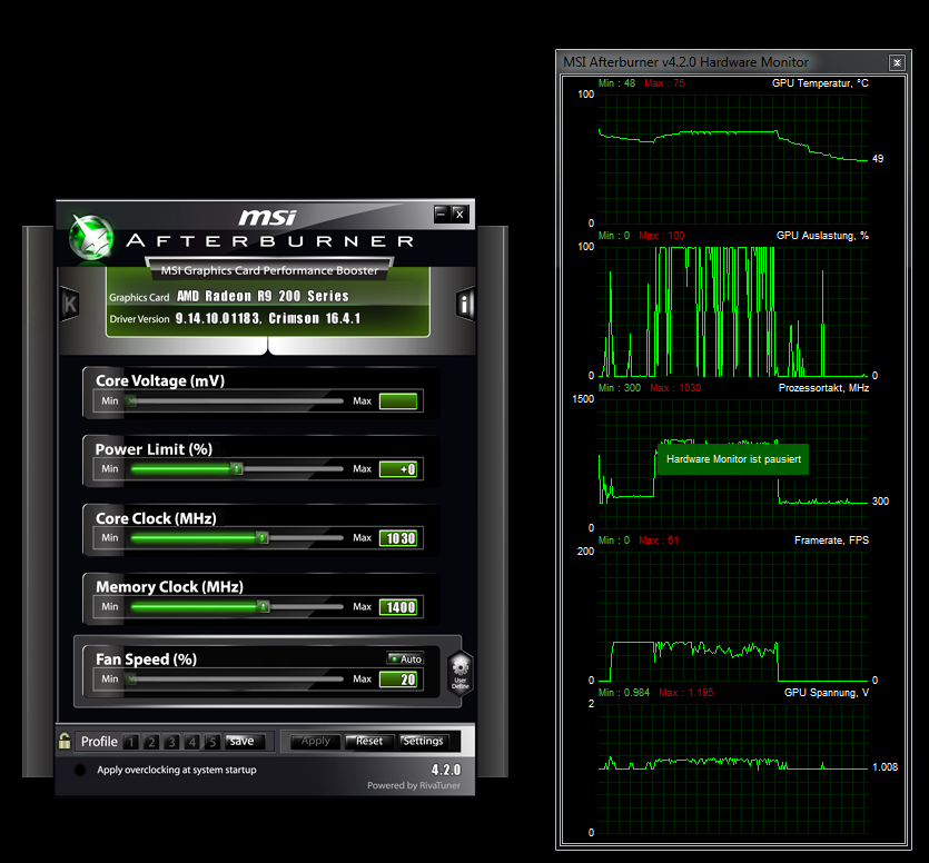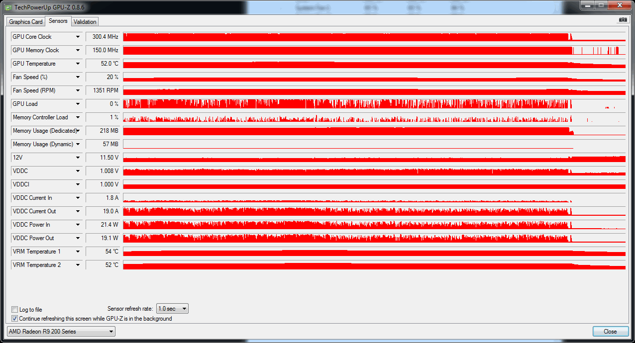 Ich hab hier mal die Werte meiner Grafikkarte gemessen. Auffällig für mich ist das die GPU Auslastung zwischen 0 und 100 prozent ständig schwankt. Hab aber schon gelesen, dass das bei der Grafikkarte wohl vorkommt
