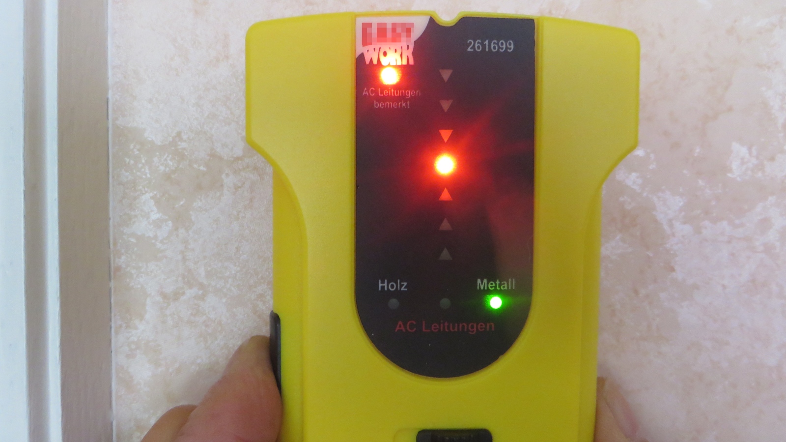 Leitungsfinder und mehr. Dieses hochkomplexe Gerät findet Stromleitungen, natürlich Metall und Holz, aber nur, wenn es von einem hochkomplexen Fachmann, wie ich es bin, bedient wird.