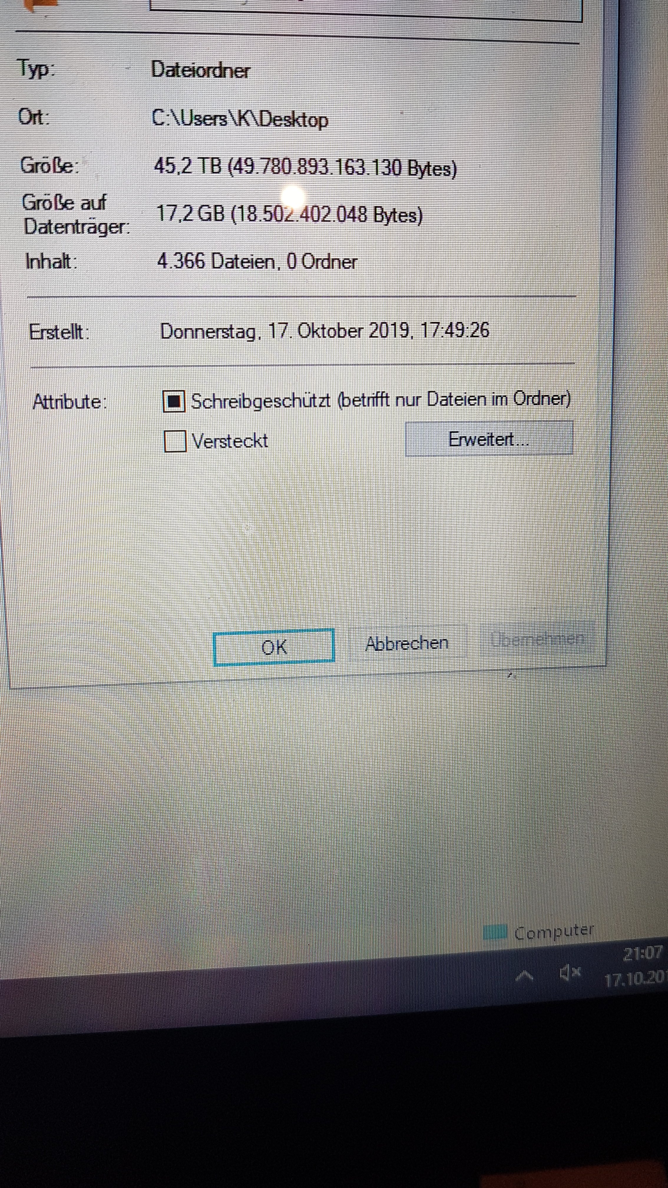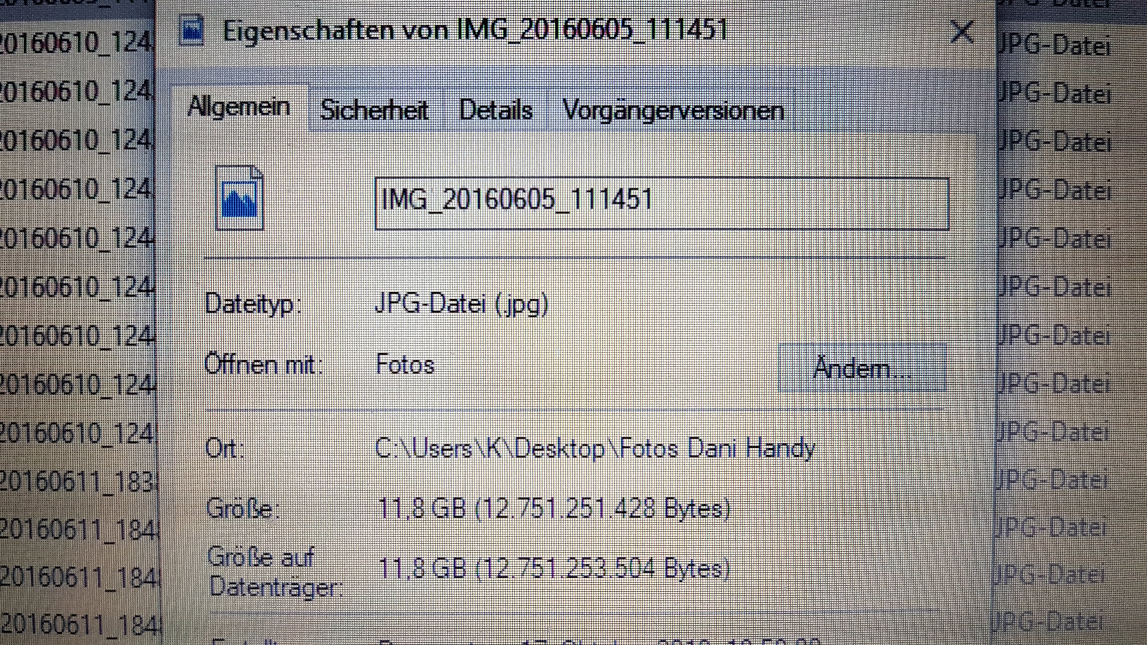 wollte heute das Handy meiner Frau "aufräumen" und gabe Bilder vom Handy auf den PC gelegt. Dann wollte ich diese Ihrer externen Festplatte zuordnen. Leider zeigt er mir nun bei jedem Bild als Dateigrösse 11,8 GB an. Bei 4366 Bildern sind das dann 45,2 TB. Anbei ein Bild aus den Eigenschaften.